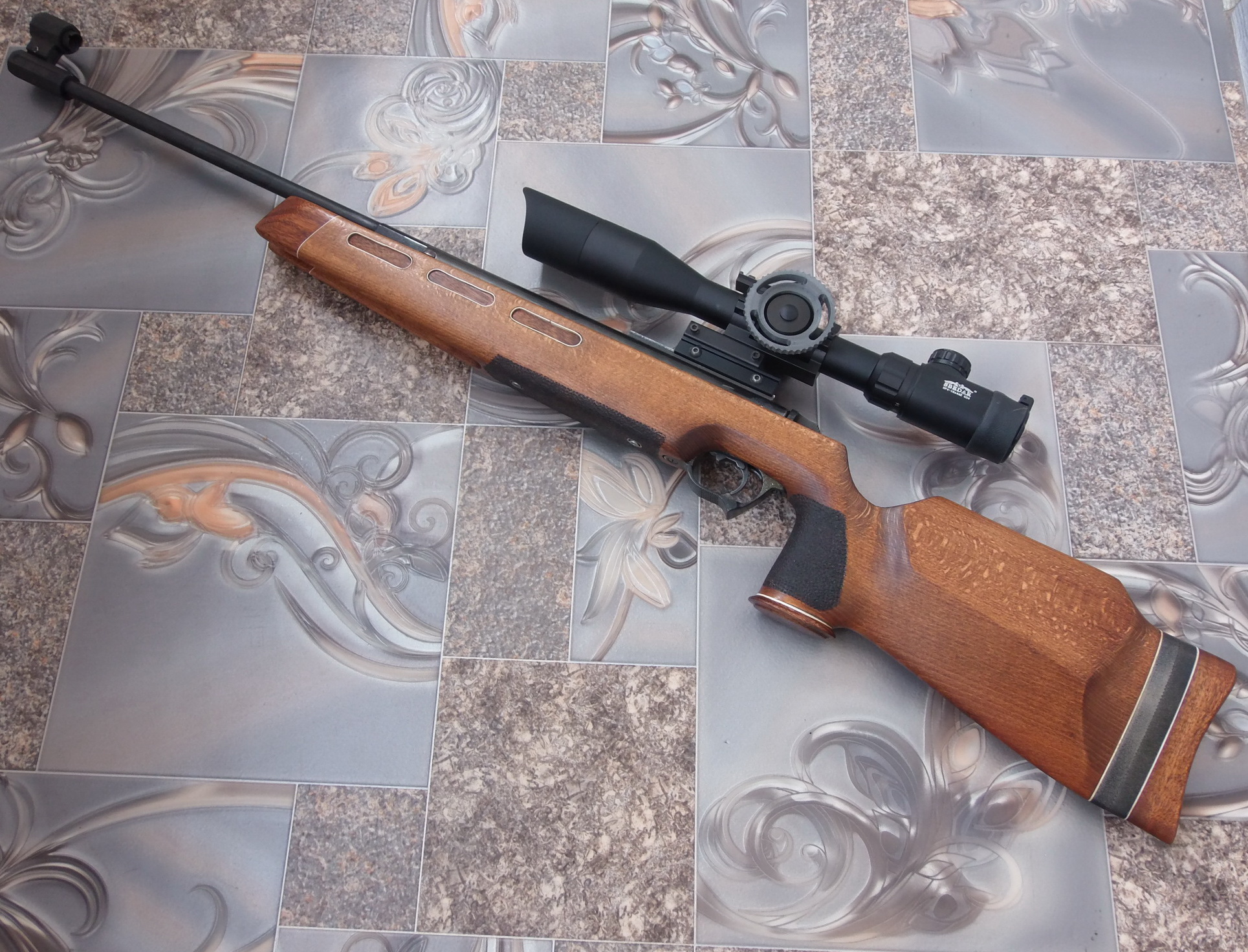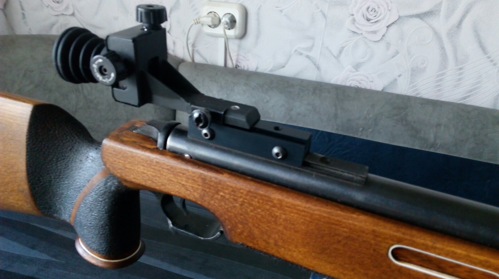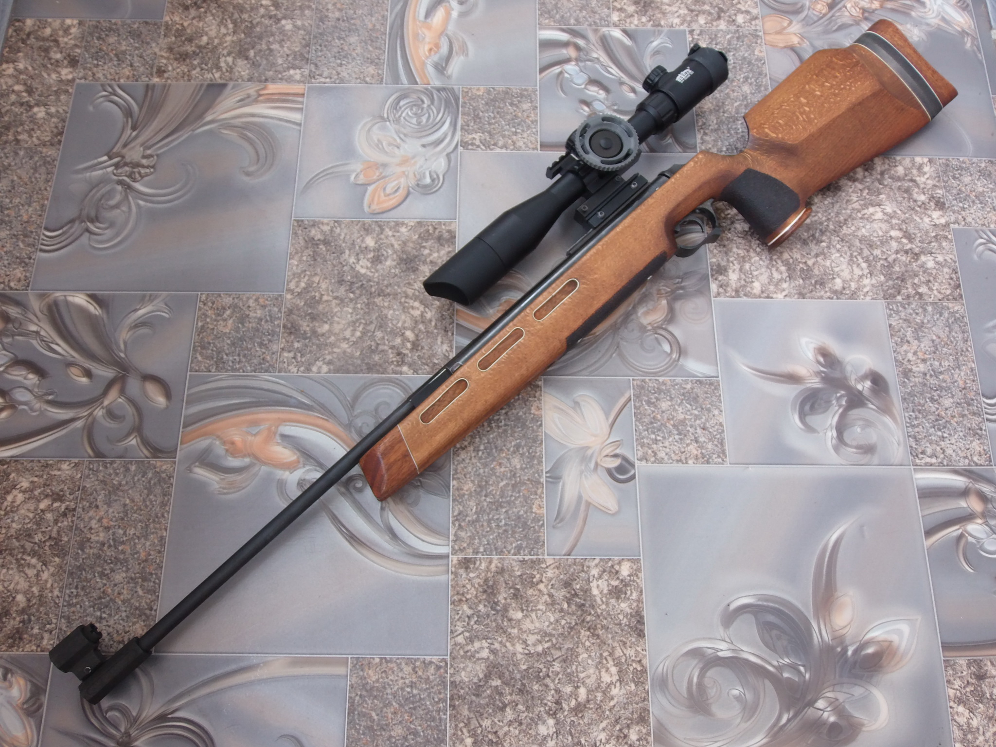 Конечно можно установить вместо диоптра и оптический прицел. Опять же-учитывая высоту мушки и чтобы она никак не маячила в объективе прицела, установить его позволит повышающий переходник. Прицел нужно поставить либо в средние кольца, или как я в моноблок с выносом. Высота щеки на прикладе позволяет весьма комфортно прицеливаться в оптику. Когда сниму видеообзор по этой работе-наглядно покажу вам оба варианта прикладки с диоптром или оптикой. Вот вариант с установленной на винтовку оптикой. Дружок Руслан изготовил мне шикарное колесо отстройки от параллакса-здесь на фото оно ещё не окрашено. Бленду с «козырьком» кстати также он изготовил-уже давненько и потому её я покрасил. Ну пока как есть посмотрите: