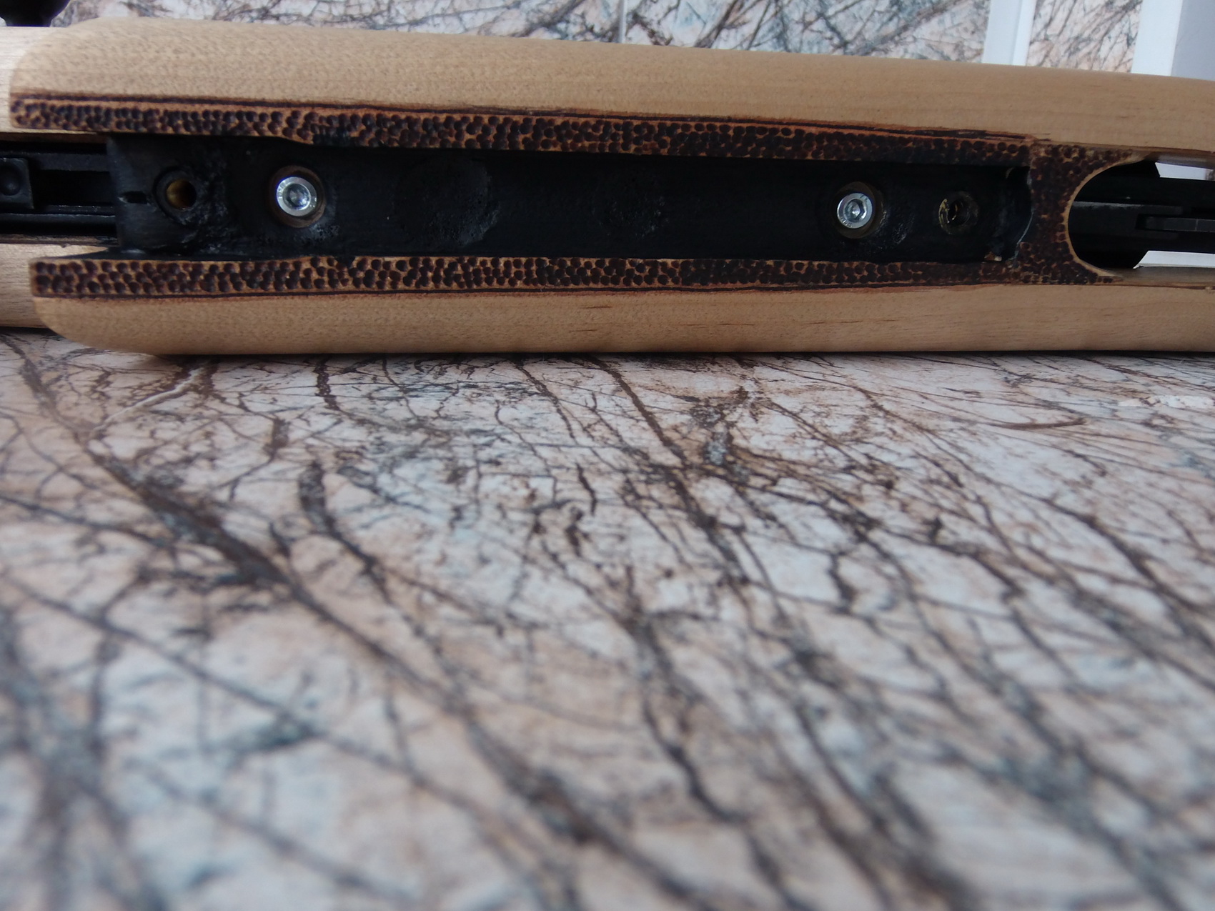 Далее была очередь наколотки на рукояти и впадине под ладонь. Округлённым керном настукал я предварительно расчертив и сделав канавки обвода эти элементы. Время заняло это конечно…… Но результат порадовал. Притемнил наколоченные участки морилкой «Палисандр». Под маслами они конечно и сами притемнились бы впоследствии, но решил пусть наверняка станет нужное тёмным. На цевье много не наколачивал-две полосы вдоль еврошины. И после вклеил на ЭДП с мет.пылью готовый задник за компрессор во втулку крепежа спусковой скобы шпилькой /саморезом и нижней плоскостью детали. Вот итог моим стараний: