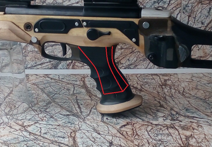 Далее приступил к изготовлению ложи.Материалом послужил берёзовый брус. Задумал сделать что-то в стиле современного пистолета-пулемёта. Приготовил к примерке эргономичную пистолетную рукоятку и скобу спусковую от турецкой винтовки. Неспешно всё расчертил, рукоять и скоба неплохо вписывались в планируемую ложу. Чтобы крепёж рукояти к ложе был максимально надёжен, при выпиливании заготовки ложи из бруска, был выпилен и посадочный шип под рукоятку. Решил одеть её на этот шип, заполнив рукоятку внутри ЭДП и зафиксировать длинным саморезом в этот шип. Т.е. выпущенный шип был одной деталью при выпиливании, а не приделан к основной ложе отдельно-несомненно такое решение было правильным, отломать шип просто невозможно. Учитывал конечно и расположение нижнего крепёжного винта железа при креплении рукояти-внутри рукояти в передней части врезана стальная втулка под нижний крепёжный винт М5. Красными линиями постараюсь отметить как располагается шип внутри рукояти: