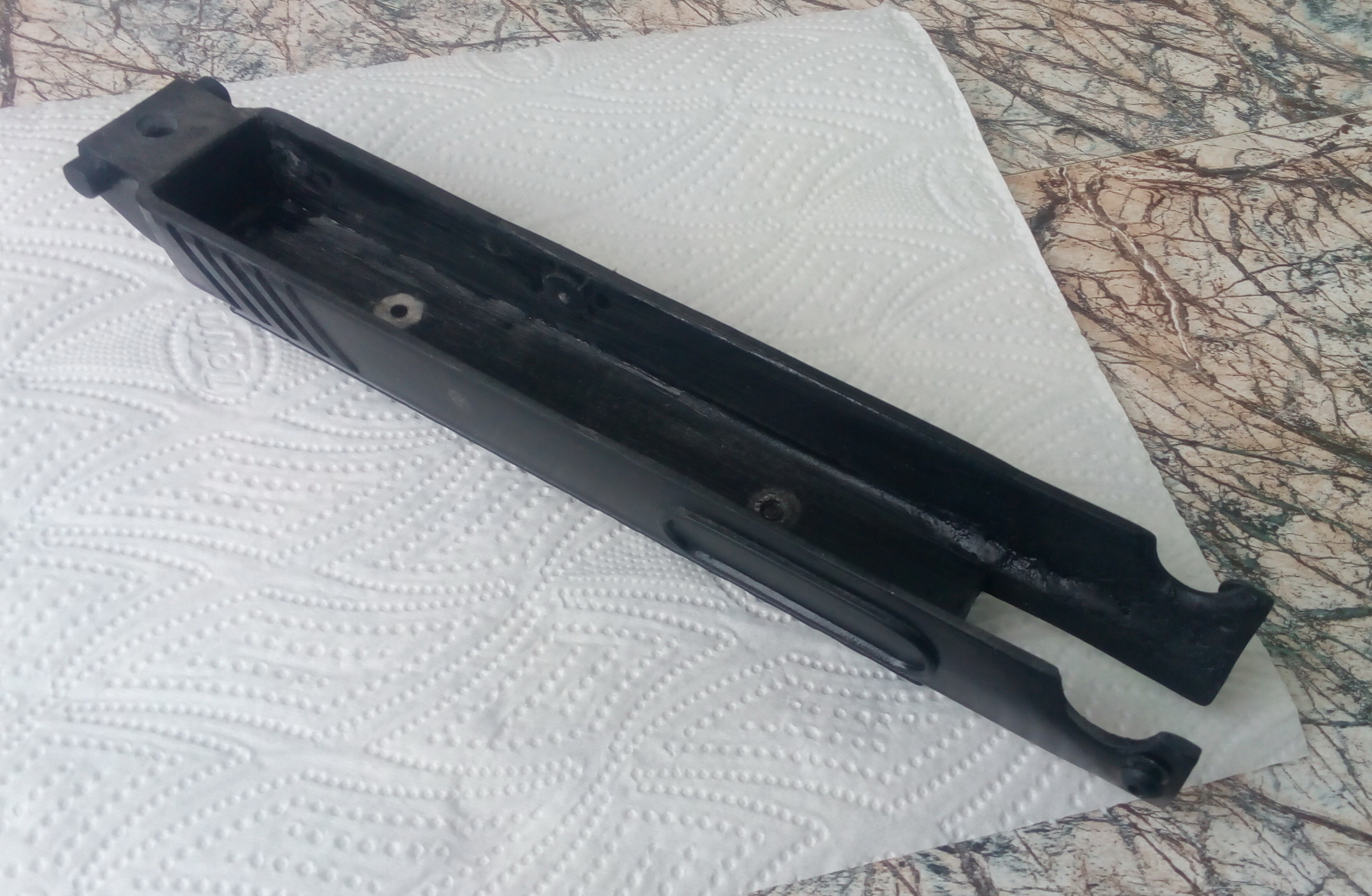 В задней части приклада снизу перед затыльником резиновым были тонкие стенки-это место я также укрепил, теперь же смесью ЭДП и мелких пластиковых и деревянных опилок. Таким образом эта пустота между тонкими стенками была ликвидирована и ничего уже не могло открошиться, отломаться при эксплуатации моего изделия. После сушки аккуратно всё обработал абразивами и вышло отлично: