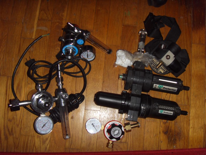 Черные колбы- это масловлагоотделитель (для покраски еороч), Три остальные- газовые редукторы, с колбами и шнурками: углекислота-аргон с подогревом (правдо на 36вольт), а красный- вроде пропановый. Озвучь в личные- сколько денег за углекислотные хочеш (не особо надо- но в запас мот возьму)?