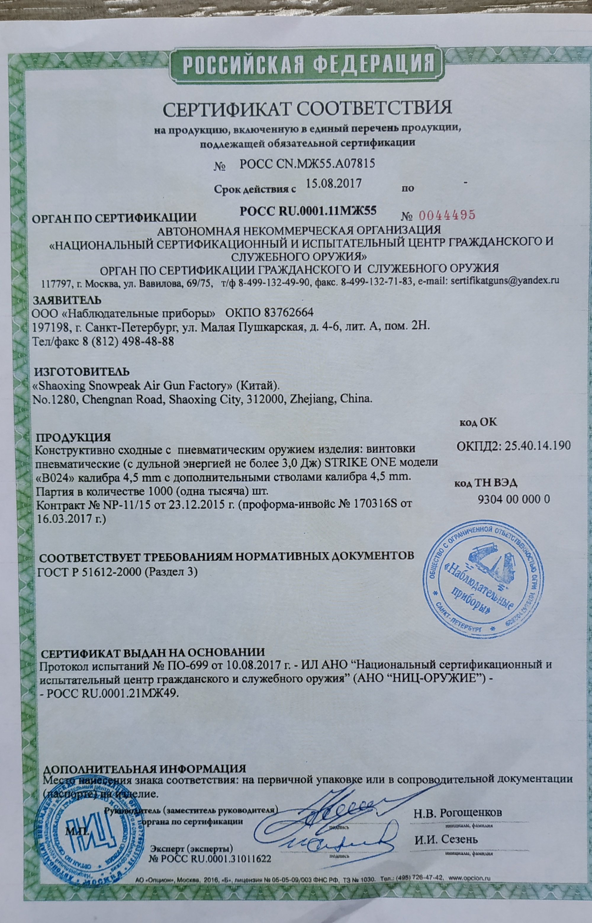 В комплекте все что на фото, включая сам винт, приклад, модератор, второй стволик с восьмеркой, два магазина, лоток для одиночной стрельбы, Комплект РТИ и документы