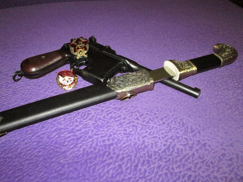 Подниму тему. А поскольку всем желающим одного штыка может не хватить, то закину попутно ещё такой прибамбас. В принципе, всё, что видно на фото (кроме диванчика) продаётся. Предметы, похожие на пистолет, шашку, орден БКЗ и знак "Командир кавалерийских частей РККА" (такой же, как у Нестора Махно) - не настоящие!!! Но смотрятся и "лежат в руке" очень достойно.