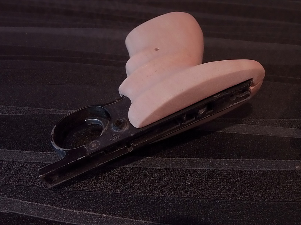 Получится полностью закрытый торец рукоятки.Осталось всё подогнать,хорошенько зачистить,потом вот такой приблудой самодельной в нужных местах под пальцы и ладонь(на задней стороне рукоятки) сделаю насечку: