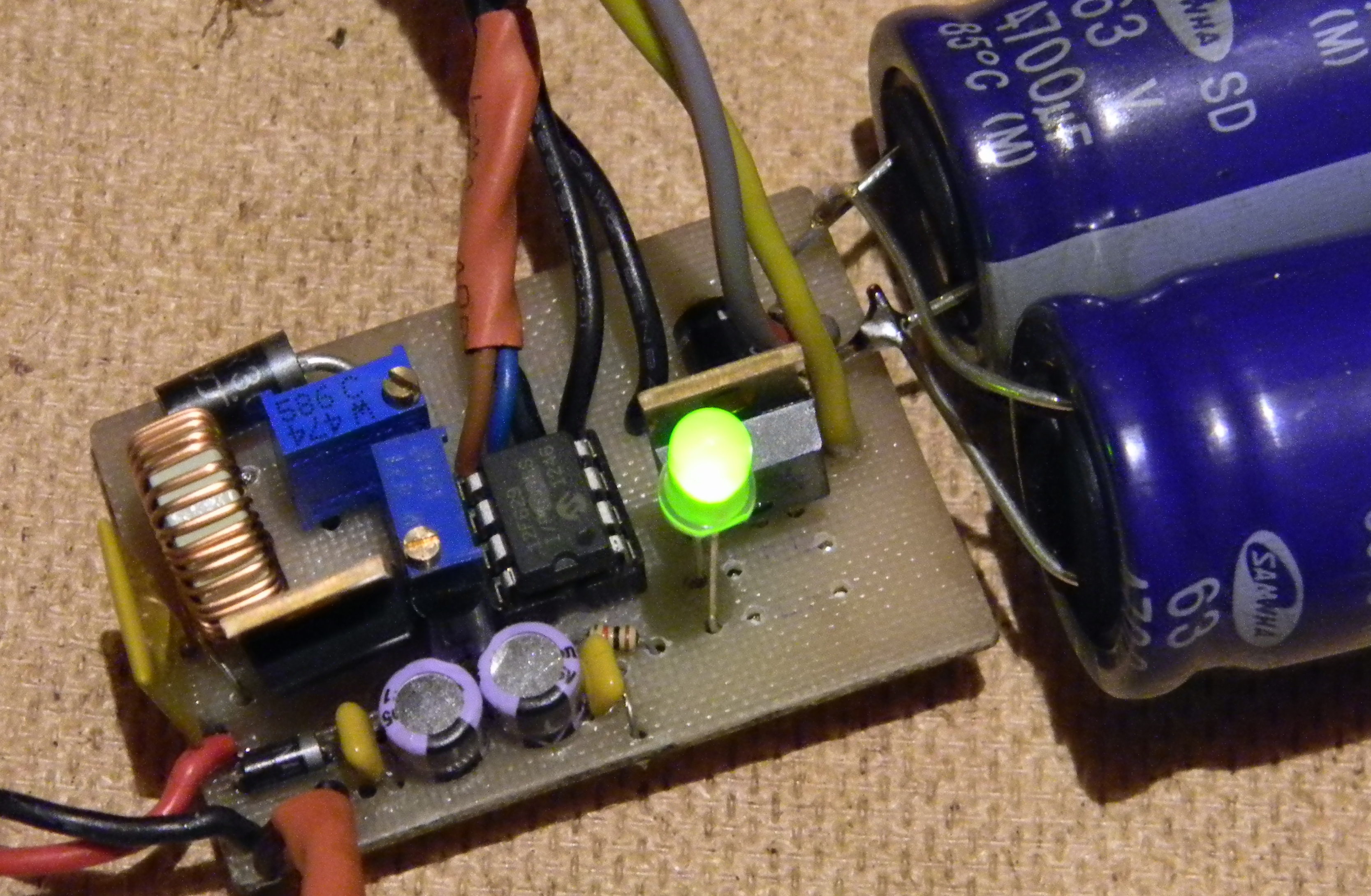 Немного изменил схему :-): , уменьшил время накачки конденсатора, на следующей неделе приедут мощные транзисторы, можно будет поднять напряжение до 100 вольт. Ну как-то так, типа самоап :-)