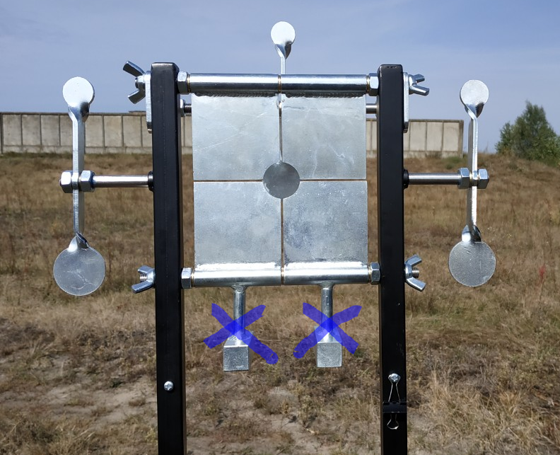 Эти центральные сектора все равно же не падающие и отклоняются от попадания пульки, поэтому нет смысла их усложнять и утяжелять. А для повышения общей жесткости конструкции шпильку с барашками можно расположить снизу секторов и закрепить на них прищепки для бумажных мишеней.