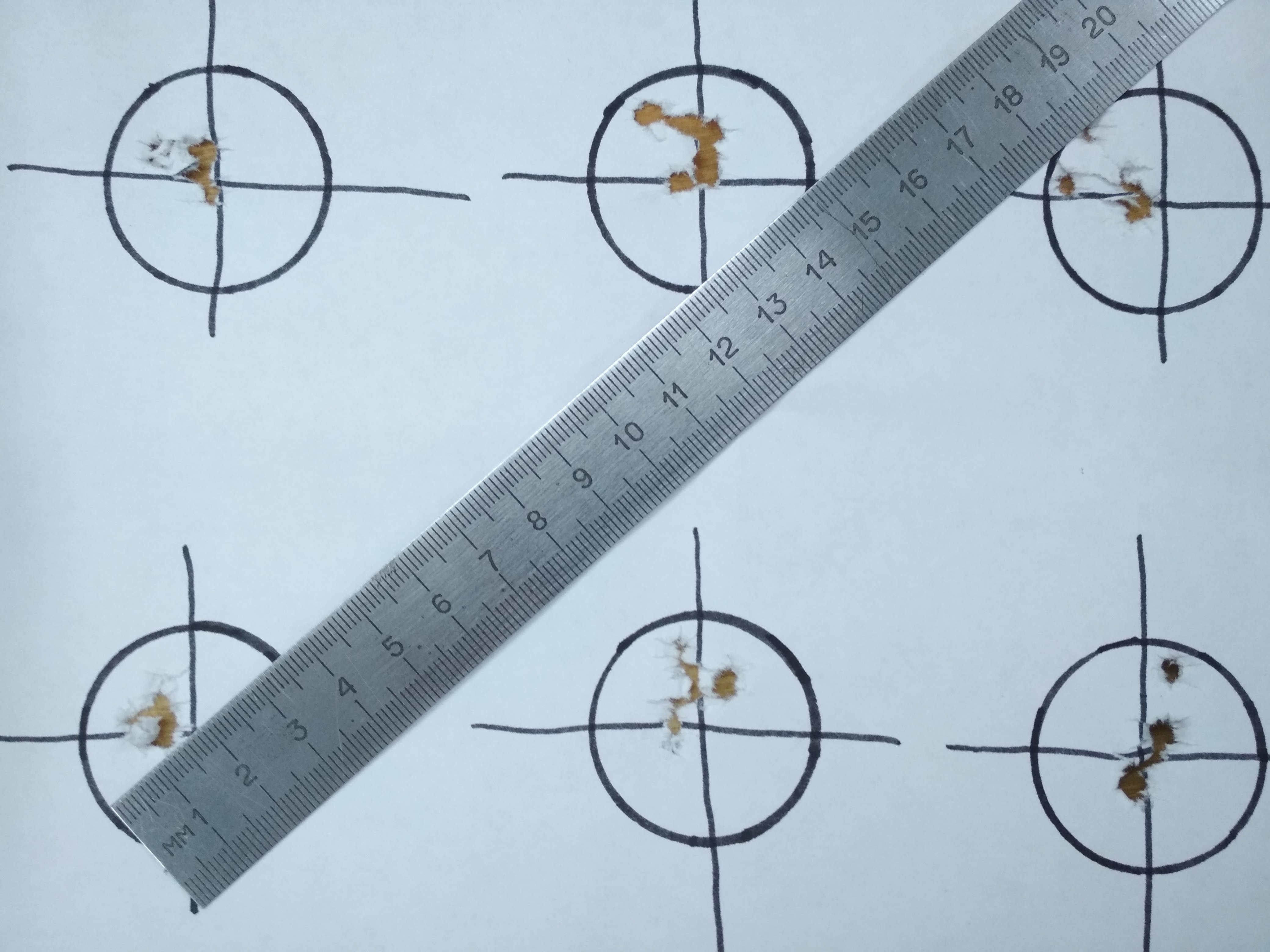 Murashka писал(а):artgt писал(а):Всех приветствую. Хотел поделиться результатом. Пули 5.5 , 1,647 г. Редизайн которые. Скорость **75. Длинна бланка 38.5 мм. 50метров дистанция. Три мишени по пять выстрелов. Летят просто фантастика. В 4.5 тоже мне понравились. Форма класная и диаметр головы у пуль полнее чем у остальных. Лудше стабилизация.
