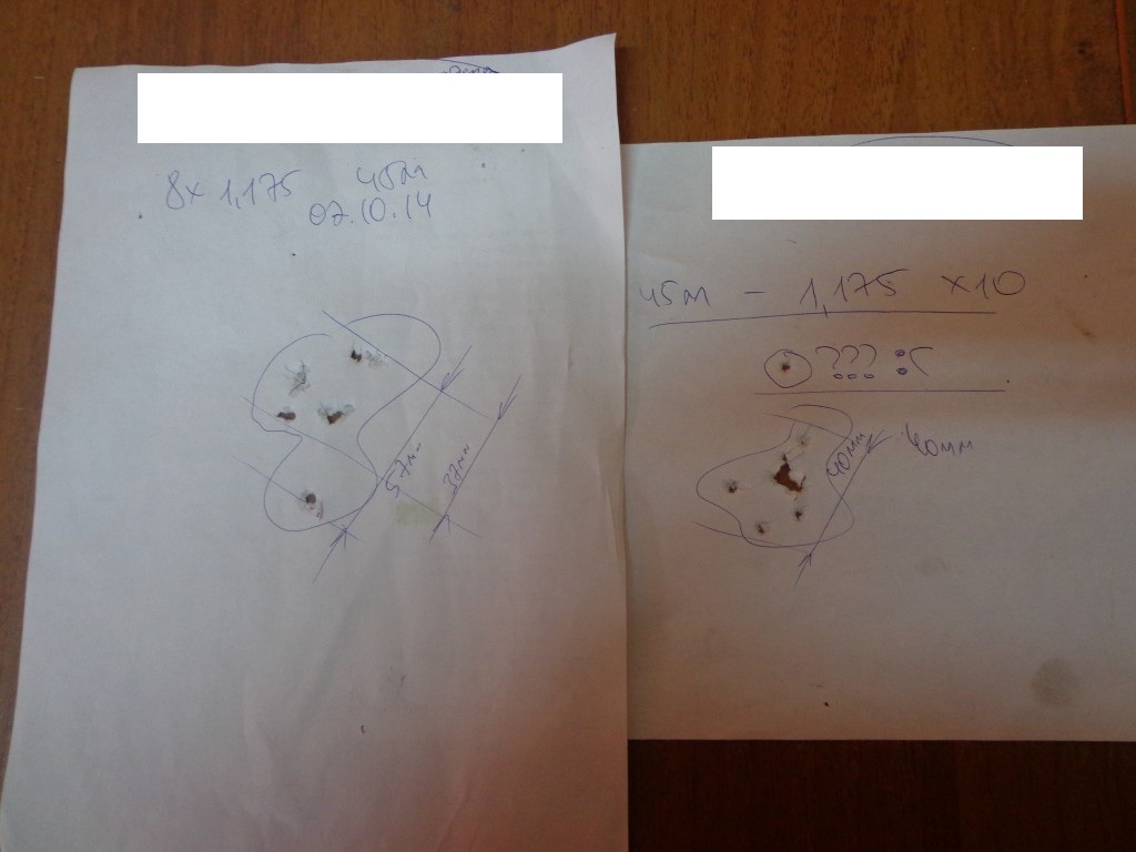 Итак, крыс был приобретен тут на форуме в довольно невеселом, как оказалось, состоянии, стрелял криво и мало. Было что-то вроде рабочего давления от 160 до 100б и д10 мыс хевиком. Такое положение дел не устраивало и крыс был отдан на доводку. Брестским мастером бы установлен редуктор(130б) и приведены в порядок внутренности крыса. После апа можно получить с 300-130б 65шутов(+10 на прямотоке) д35 хевиком или д45 1.03. Сейчас настроен на 3.5Дж. По точности прилагаю картинку, считаю что для данной ценовой категории показатель очень даже ничего. Также был куплен костыль, т.к. в пистолетном вид было тяжело( старые накладки в комплекте). Прицела на выбор 2, липерс 6-32 с милдотом и подсветкой или беларовский ПО 2.5-10х48 (с легкими косячками). Цена вопроса - 480 с одним прицелом, 500 с двумя.