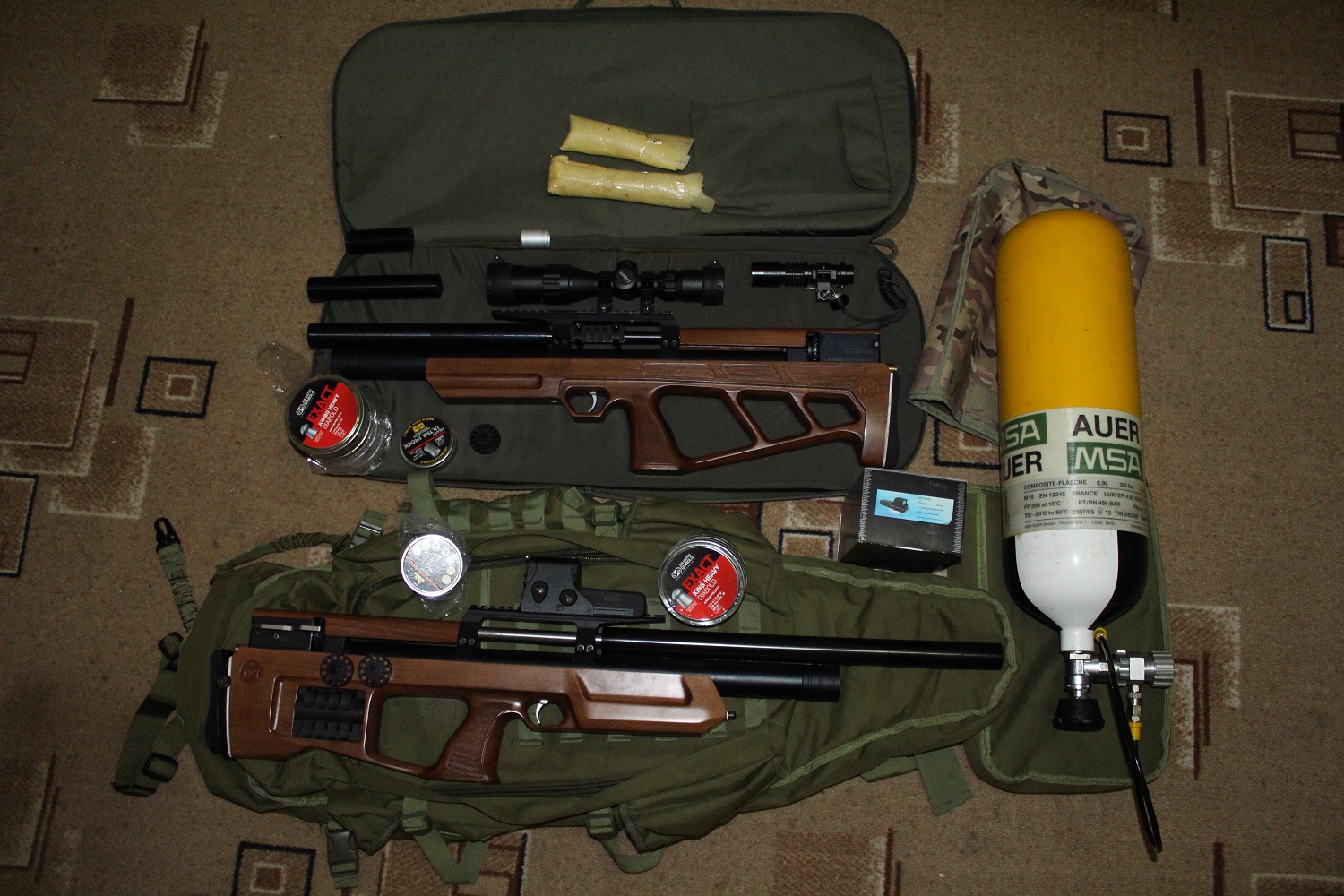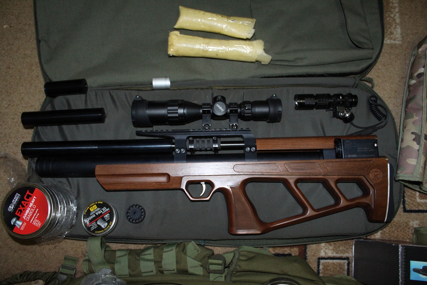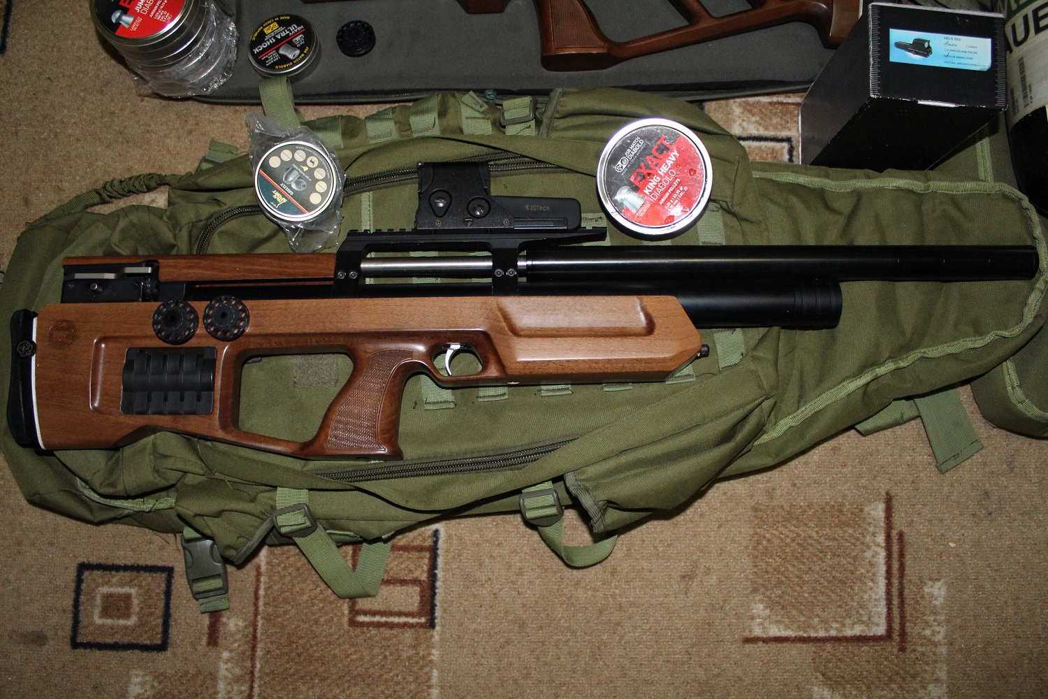 Крикет папа. В комплекте два барабана, щека, оптика 3-9-32 липка, чехол, куча пуль. С родным модерм 850 енотов с многафункцинольным разборным от бик трак +100. С кучами все в порядке скорость 291 мс стабильна.