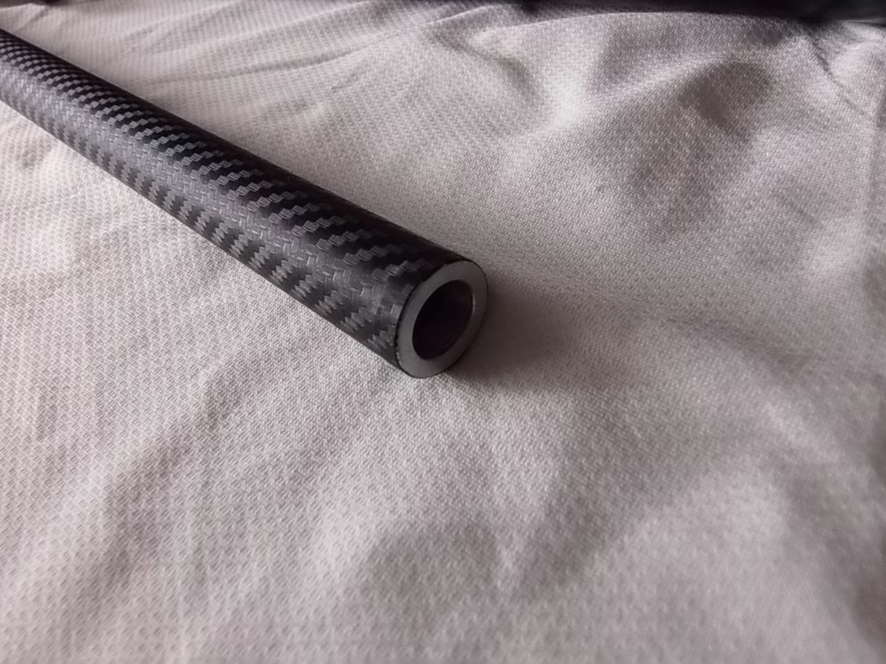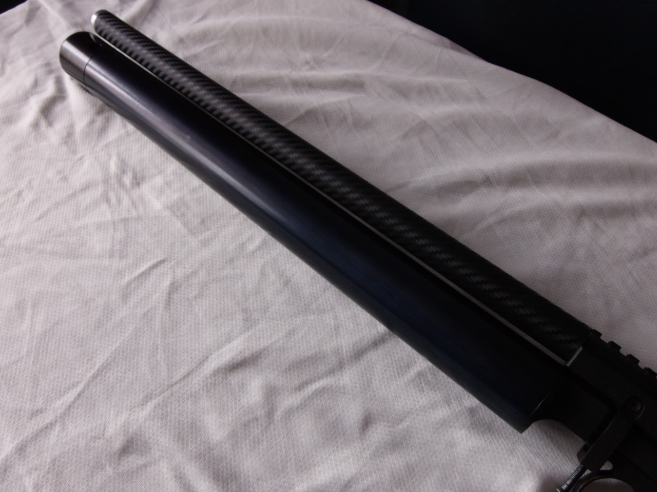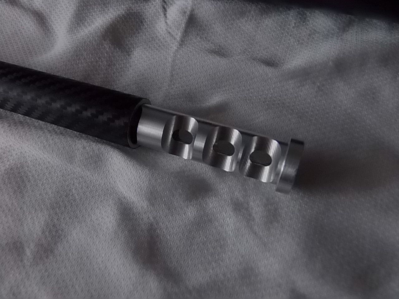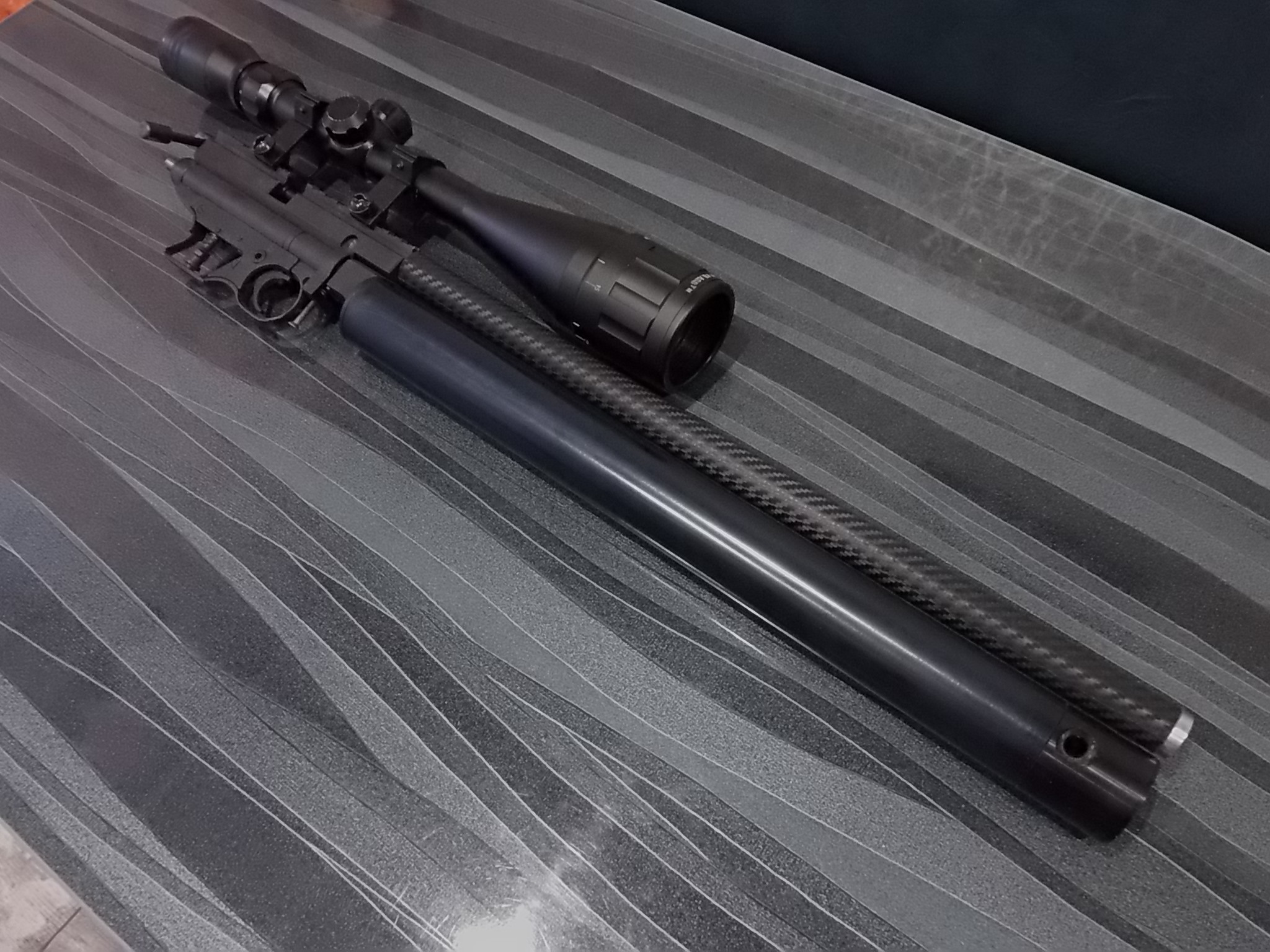 6)Саундмодератор.Выточен рассеиватель звука.Материал-дюраль.Корпус модера-алюминевая трубка диаметром 20мм.Длина модератора в сборе 415мм от коробки до среза.В задней части корпуса есть втулка под диаметр ствола.Корпус модератора одевается на ствол,в передок её вставляется рассеиватель,вращением вместе с трубой навинчивается рассеиватель на резьбу,которая нарезана на стволе.Туго закрутить(до упора)-держится отменно! Корпус оклеен карбоновой самоклеящейся плёнкой.Рассеиватель не анодировался-ни к чему думаю.