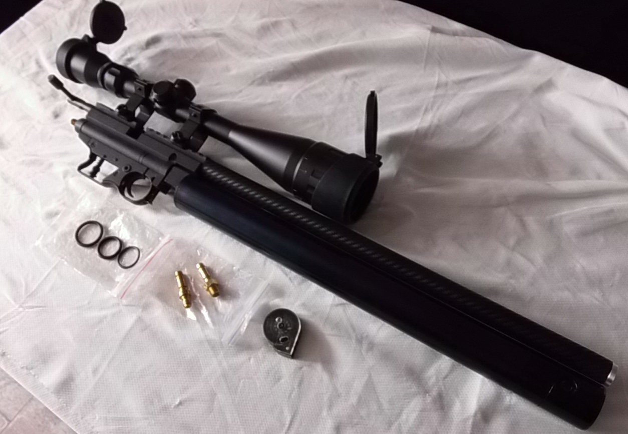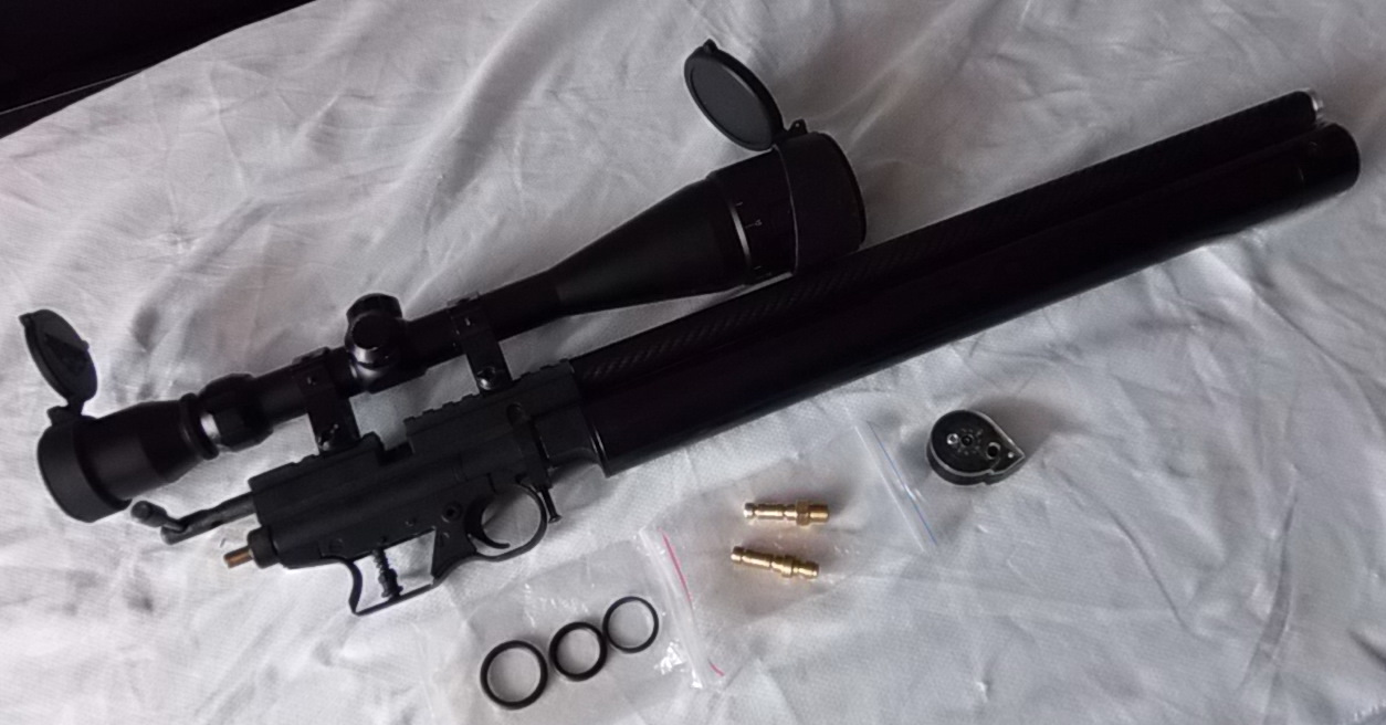 Итак комплект: собранное воедино изделие,заправочные штуцеры,барабанчик Крюгера 10-ти зарядный,ЗИП,прицел оптический(это по желанию).