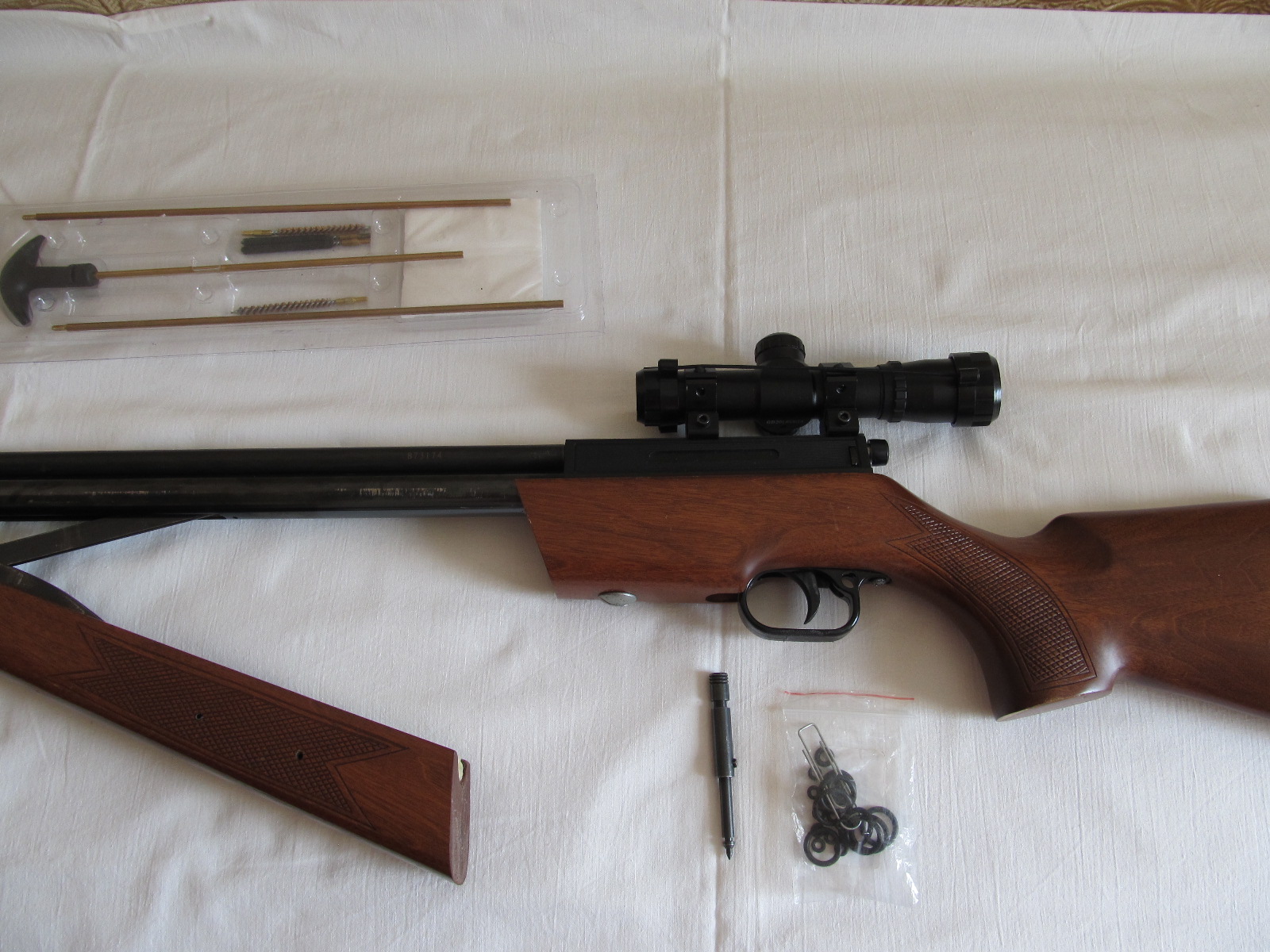 В комплекте с винтовкой идёт прицел Щ4.5х20, набор для чистки, родной досылатель, и резинки для замены в накопителе и досылатиле. Могу ещё добавить несколько досылателей для разных пулек.