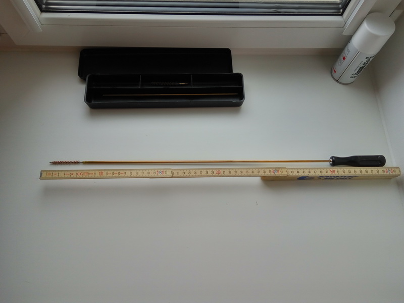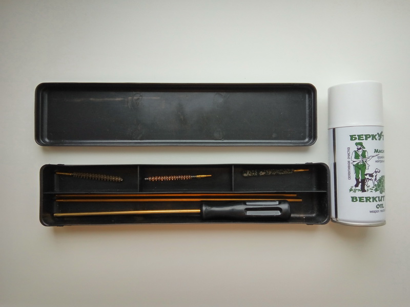 Мало б/у всего 2 раза. Ружье продали, набор следом. При второй чистке дал попробовать чистить ребенку, сломали резьбу на одном колене (видно на фото). Это абсолютно не проблема, длины хватает чтобы почистить ствол, да и нарезать можно резьбу при желании. Масло также полный баллон нажимали 2 раза.