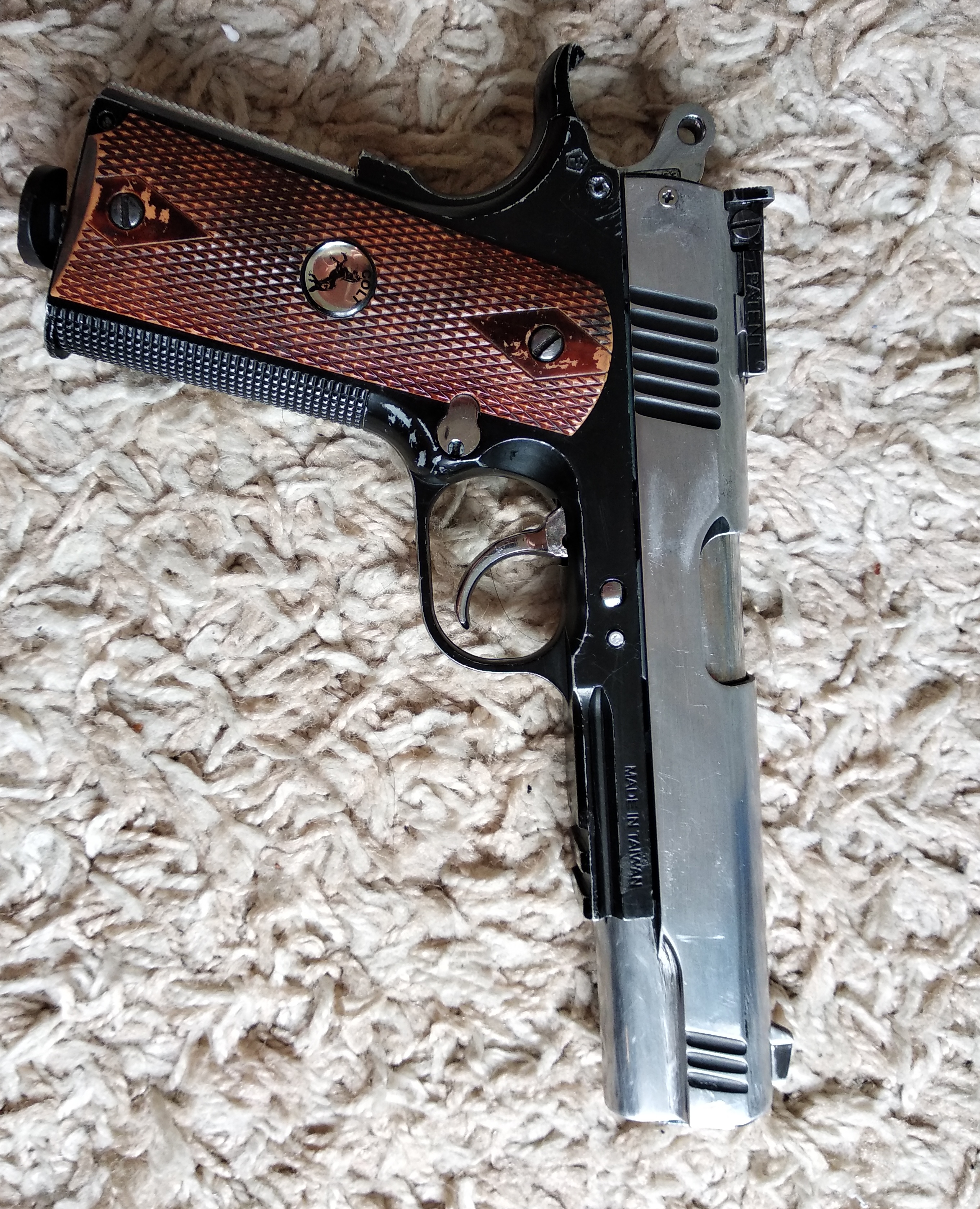 Продам неплохой пистолет кольт. Без блоубэка, вес с баллоном и шариками около килограмма. Затвор и рамка сделаны из метала, внутрянка - силумин. В магазин влезает 15 шариков бб, однако больше 13 лучше не запихивать. Клапан все таки немного подтравливает, но не критично. Начальная скорость 120-125м/с, 50-60 пуков с баллона. Кстати отличается завидной точностью среди шароплюев. В нагрузку отдам ещё один ремкомплект. Цена 120 бун. Писать в лс и звонить +375295090572