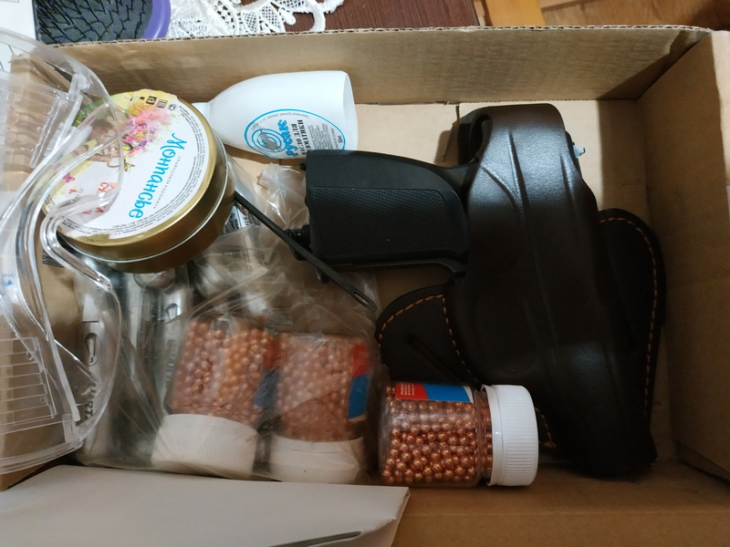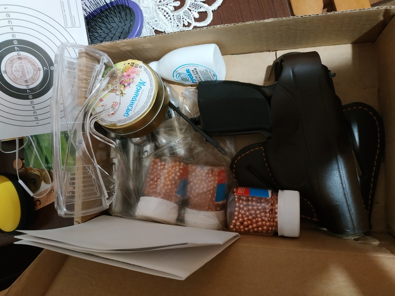 Пистолет, новая поясная кобура, немного расходников, баллончики, шарики, пулеуловитель Gamo (немного пробитый) с креплением мишеней, 3 упаковки мишеней, смазка, всё, что видите в коробке.