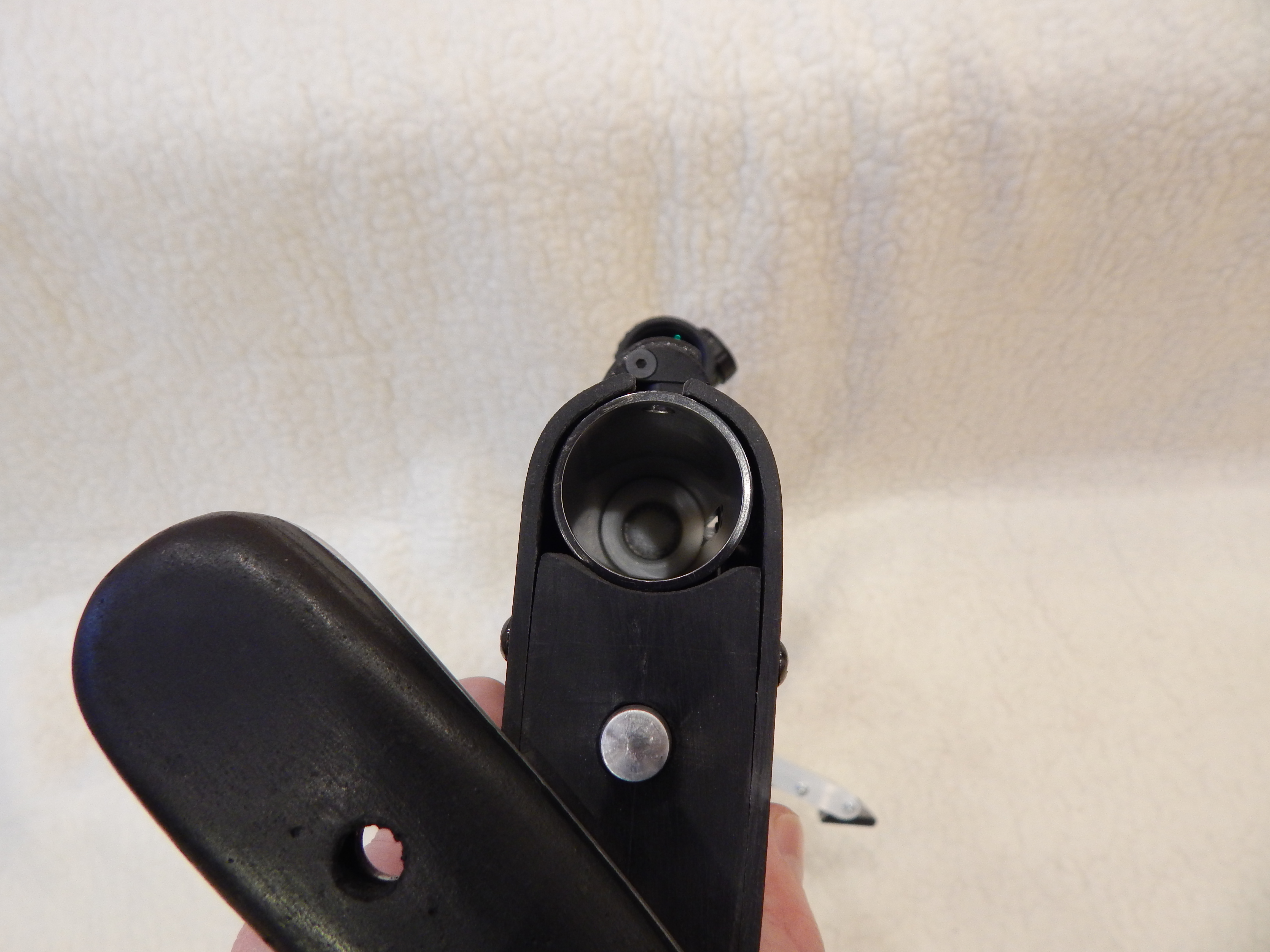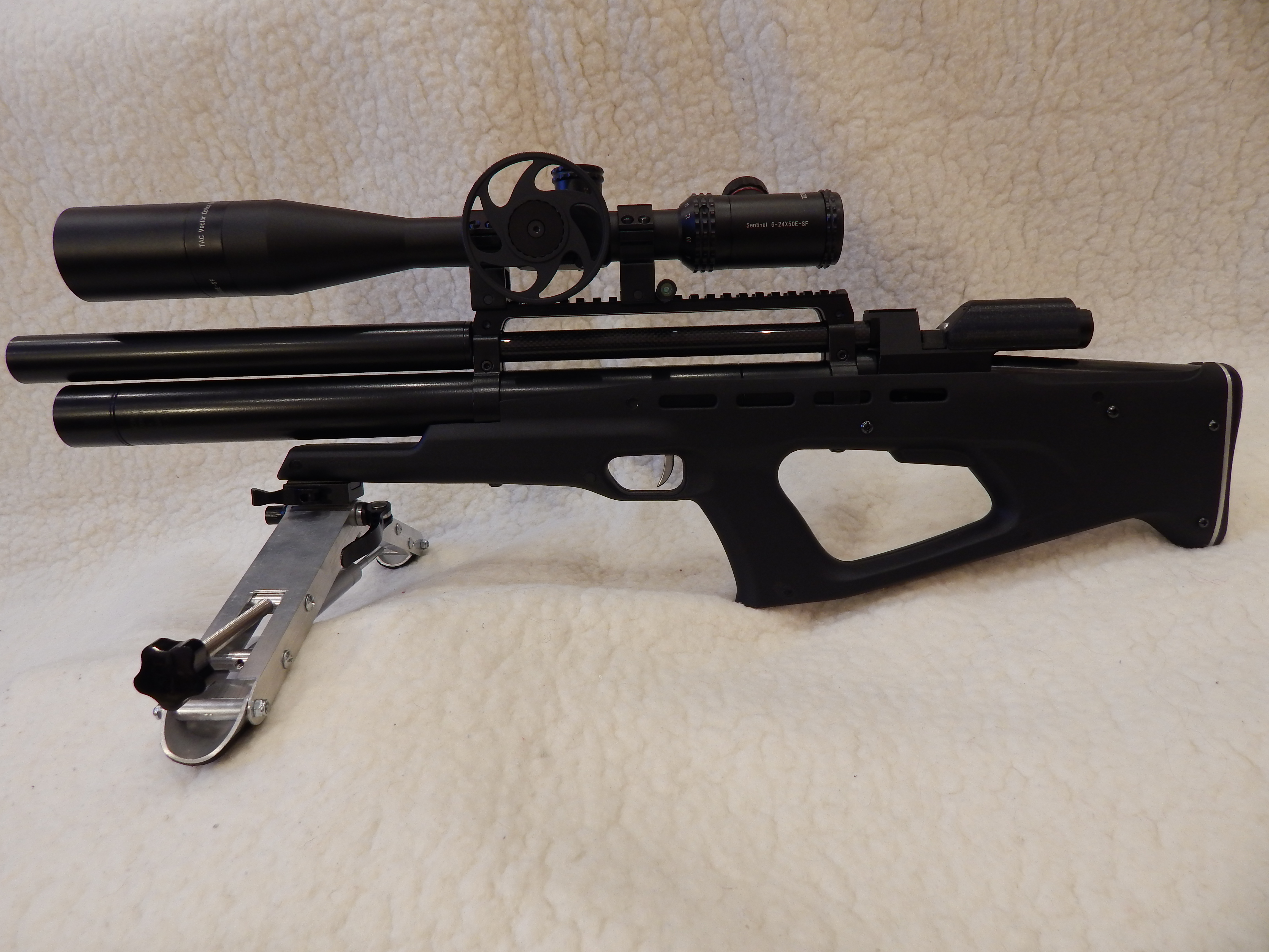 Коробка биатлонка с ластой, гравировкой, щекой 3D печати. Усм от МР 60 с дополнительным винтом второй ступени. Труба ударника перешлифована и заворонена. Резервуар 430. Редуктор проставочный стандарт 75мм. Задняя пробка под седые калибры. Передбняя пробка без резьбы под крышку, сдвижная. В пробке есть стравливающий винт. Поскольку в новых пробках добраться до манометра это целое кино. Мост под прицел 205 мм , с углом в 15 градусов. Модер ф30 эксцентрик, цельно-фрезерованный. В модер добавлена дополнительная камера в 25 мм длинной. Бланк длинной 38.5 мм. Бланк не ЛВ. Перенос спуска хенд мэй. Упаковка в ложе и разработка откидывающегося тыльника так же моё. По поводу ложе. Мне важен вес. А вес пластика минимален. А по причине частого проникновения в трубу ударника за регулировками. Была разработана данная схема тыльника. Это всё в двух словах. Подробности при личном визуальном осмотре.