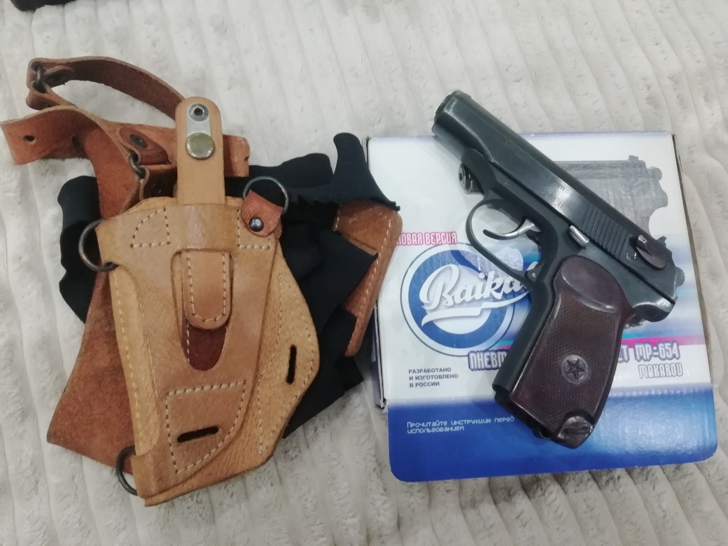 Продаётся Пневматический пистолет МР-654К "Макаров" б/у + в подарок: кобура с какими то примбабасами видно на плече вешать + около 300 пулек + 5 баллонов с газом "Quatro".