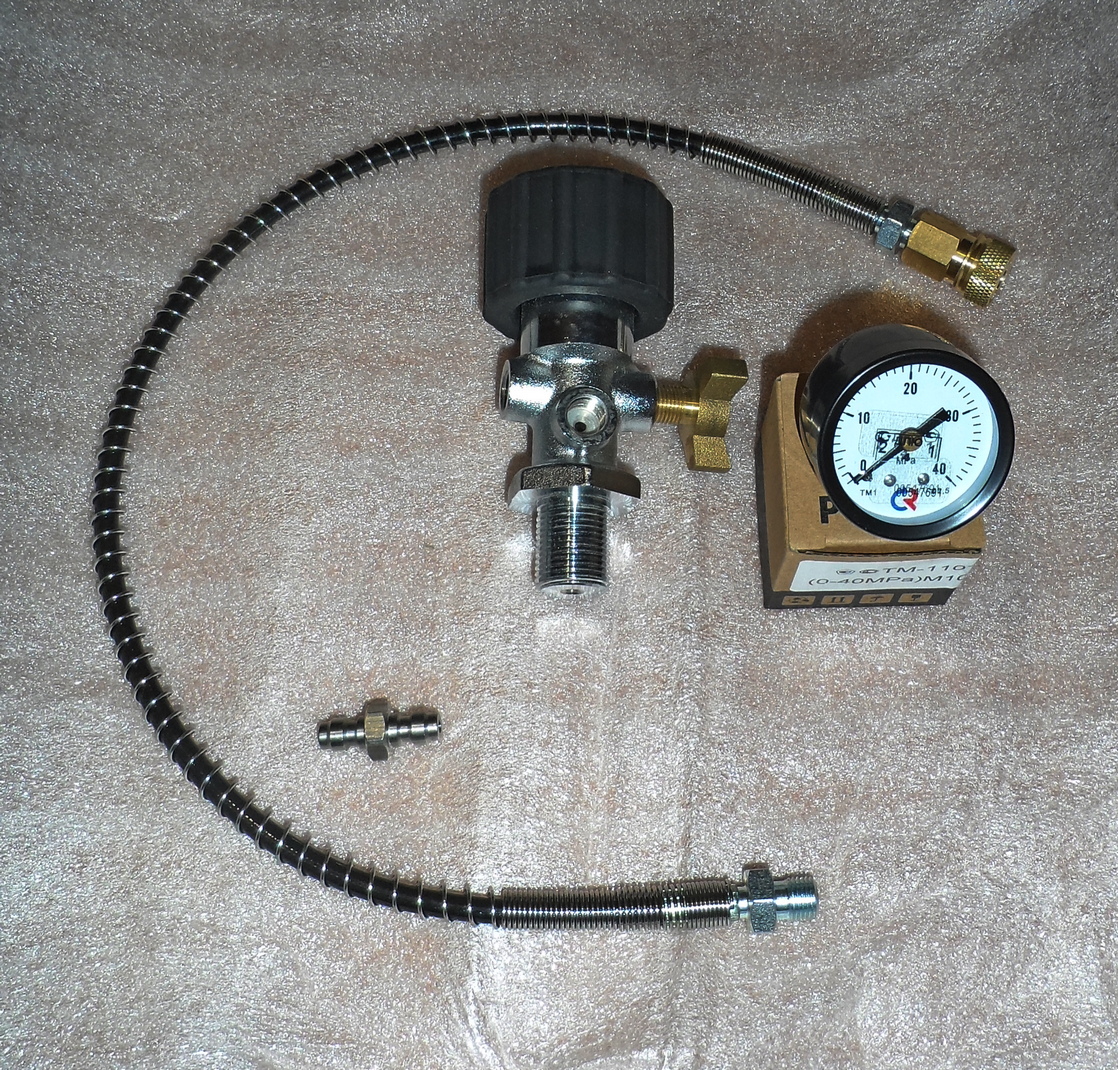 Комплект для дозаправки. Новый. Очень удобно брать с собой, как дополнительный источник воздуха. Объем колбы 0.45 л. Рабочее давление 300 атм. Манометр показывает давление в колбе. В комплект входит