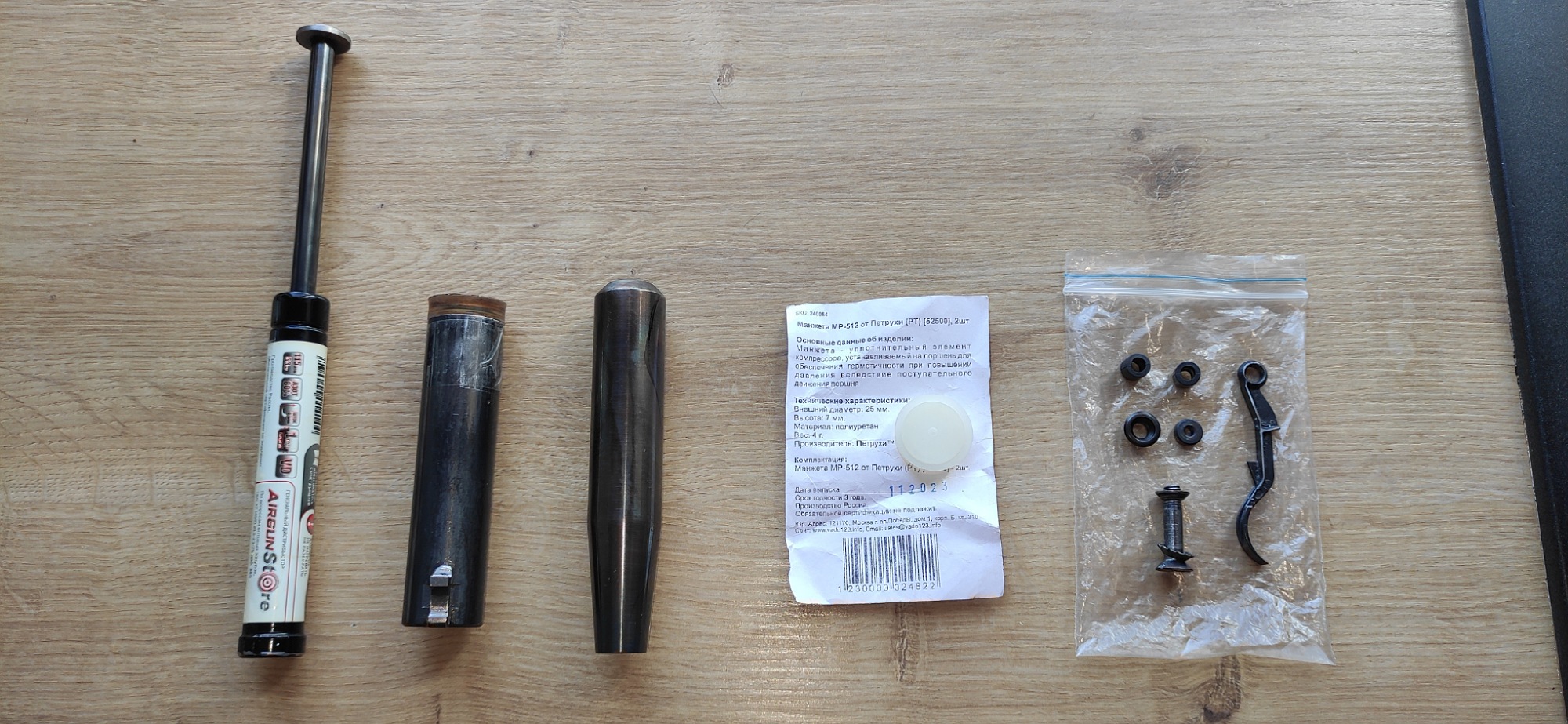 Пружина газовая от Vado123 - 80 руб, поршень 3-х составной - 25 руб, надульник-утяжелитель - 30 руб, манжета от Vado123 - 10 руб, россыпь в пакетике - 25 руб.