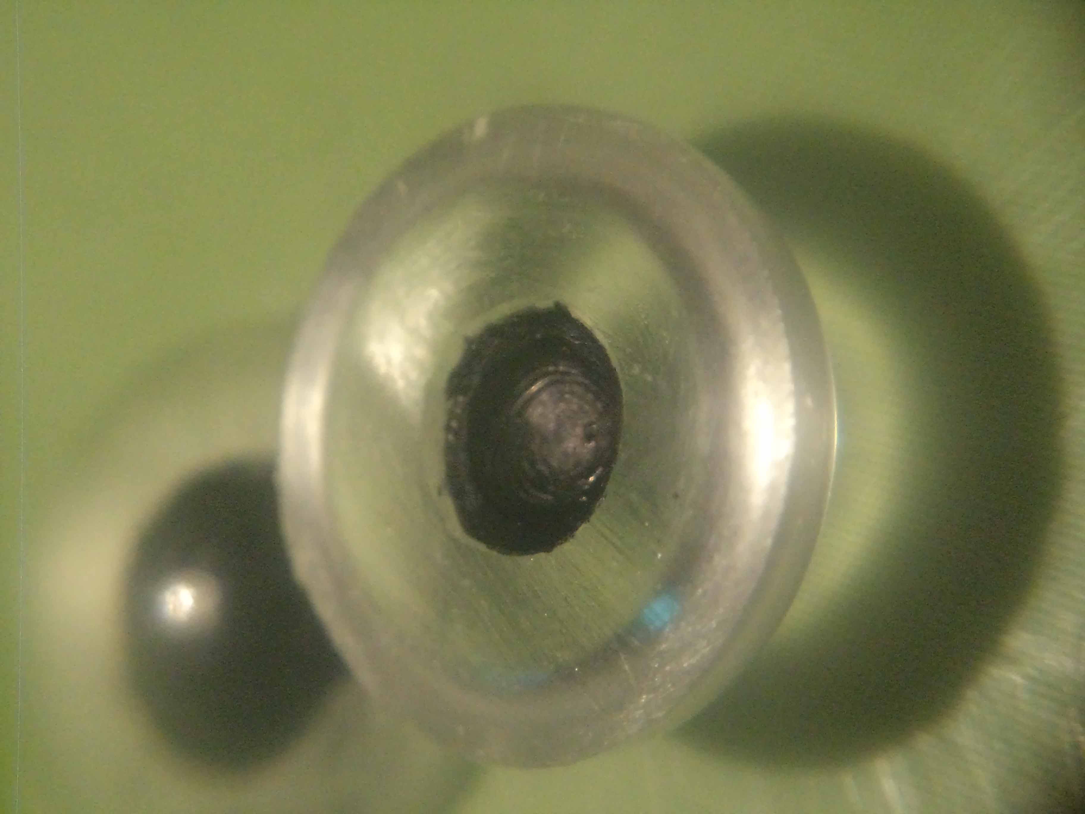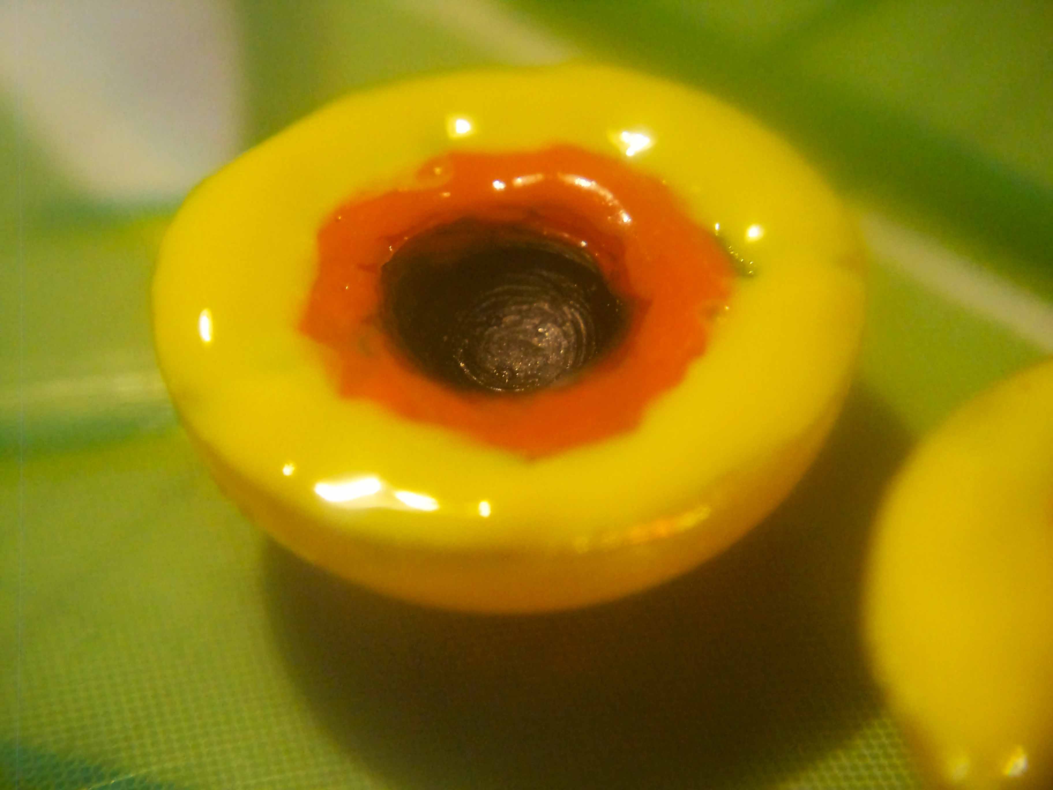 ...вернуться хочу к глазам... сейчас глаза на фирмах дорогие да и со временем тускнеют на свету...вот хочу опять поднять эту тему...на конец сезона по птице решил улучшить глаза - использую те же полусферические пуговицы...стачиваю ушко под нить, ставлю по центру кЕрновую точку ножом, и потом сверлами 3 и 5 мм углубляю на 1.5-2 мм, краской акриловой по краю углубления (зрачок) на ширину около 1 мм делаю по кругу полоску, сушу, затем такую же, но шириной около 2 мм - оранжевой и остальную плоскость - желтой, ну вообщем получилось вот так...