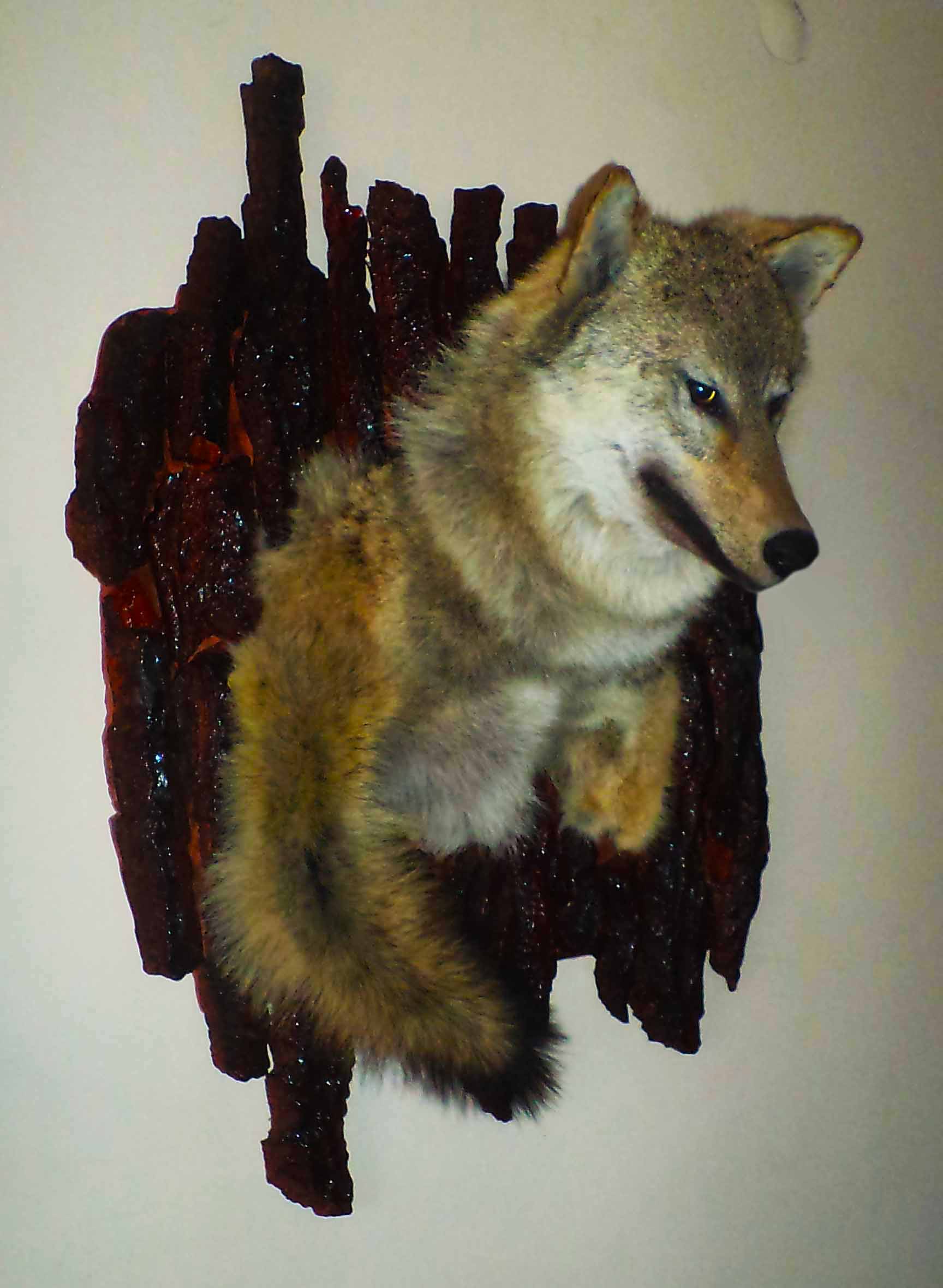 ...представлю свою первую волчицу..... стреляна она в декабре 2016 года начинающим охотником из с.Вербовое восточная часть района, ружем Cobalt SA28 12k между Чингульской и Терешковской балкой вблизи села,... увидели стаю случайно, "влет" собрались, местные охотники следили 4-5 голов по снегу от села, там на ее окраине волки ушли в балку, а дальше гнали их с трех сторон на машинах, пытались догнать и отстрелять, но добыли только молодую самку 2-х летку, остальные ушли (ш-47.40230711784592...д-35.94798226564854),... стрелял молодой стрелок раза четыре "8.2" или "трио",.... два в грудь и два в бок (вродь так), долго искали других, но по пустому .......потом туша пролежала у стрелка в гараже около трех дней при 0...-5 градусах, не знал чего с ней делать.... и в итоге на половину испортилась - при снятии пошел запах и шкура от зада до груди уже была в зеленой гнили....пришлось отрезать выше груди и морочить ее дальше... в итоге такой образец и получился....