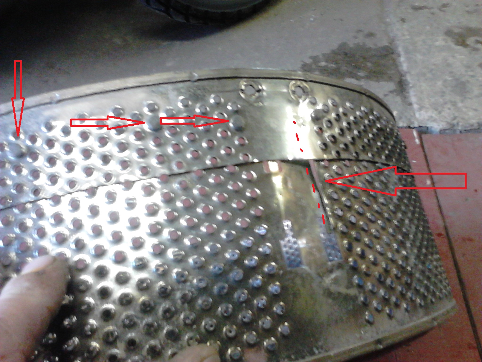 Приложил барабан загрузочной горловиной к листу 2-ки обчертил и тем же лобзиком аккуратно вырезал круг-дно. Вставил внутрь и убрав на инверторе мощность на 0 точками приварил.