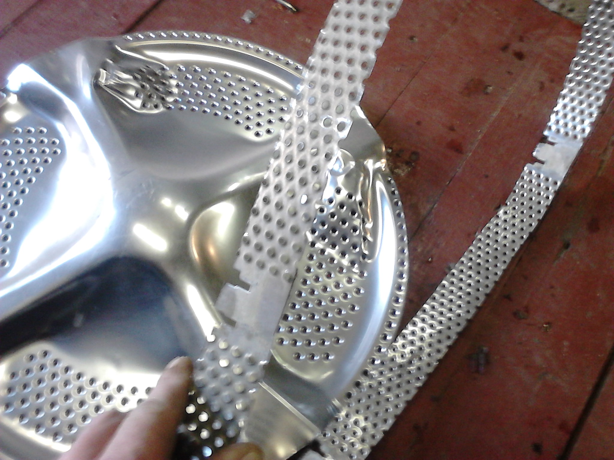 Прорезав два надреза по ребру, деревянным молотком напиндючил на торец отрезанное с другого конца барабана аккуратное кольцо с завальцовкой. Выколупал из кабеля медную проволоку и наоткусывав от него кусочков, проклепал заклепками.