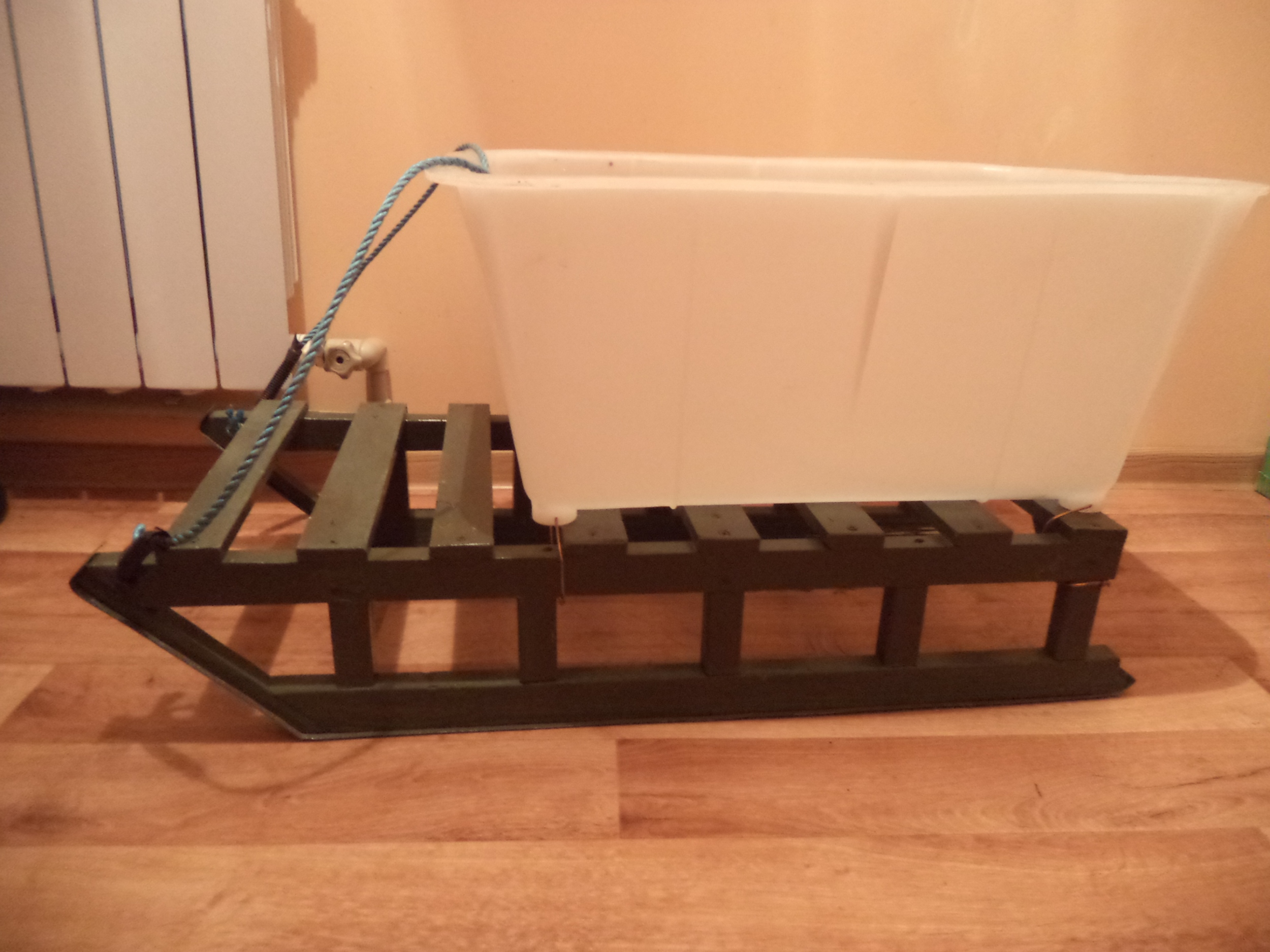 Начну, пожалуй, с того, на чём можно доставить всю свою амуницию на водоём - санок. Однажды, решил взвесить все свои зимние снасти, получилось где-то под 20 кг. Согласитесь, что если приходится пройти за день несколько километров, то эта ноша становится непосильной. Вот и решил изготовить себе санки из ... дерева. Да, санки полностью деревянные, только на полозья прикрепил полоски жести из оцинковки. На санки прикрепил полиэтиленовую ванну, куда помещается весь скарб, а спереди ещё остаётся место для ведра с живцом. С такими санками хожу на "дальняк", если приходится пересекать дорогу с участками без снега, а также они отлично скользят по чистому льду. Но вот если снега по колено, а также если на льду под снегом вода, такой вариант не годится: мокрый снег прилипает к полозьям и приходится тянуть за собой большой ком снега. В такую погоду я использую промышленные пластиковые санки. Они отлично идут по глубокому снегу, а также по воде (как лодка)
