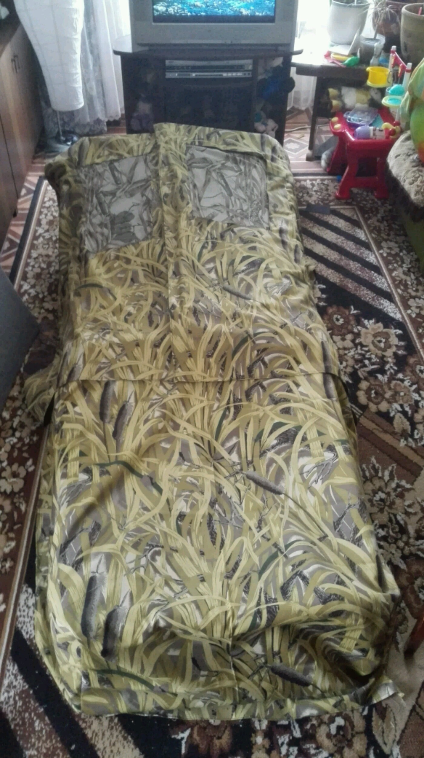 стоимость материалов,примерно 350 тыс+работа 300.Мы материалы покупали на 4 человека и было чуть дешевле.А так получается 285 тыс (подкладка и камуфляж) + 100 тыс (утеплитель).Может кто найдет дешевлеСтавров писал(а):Какая будет цена скрадка из ваших материалов?спасибо,можно личные...