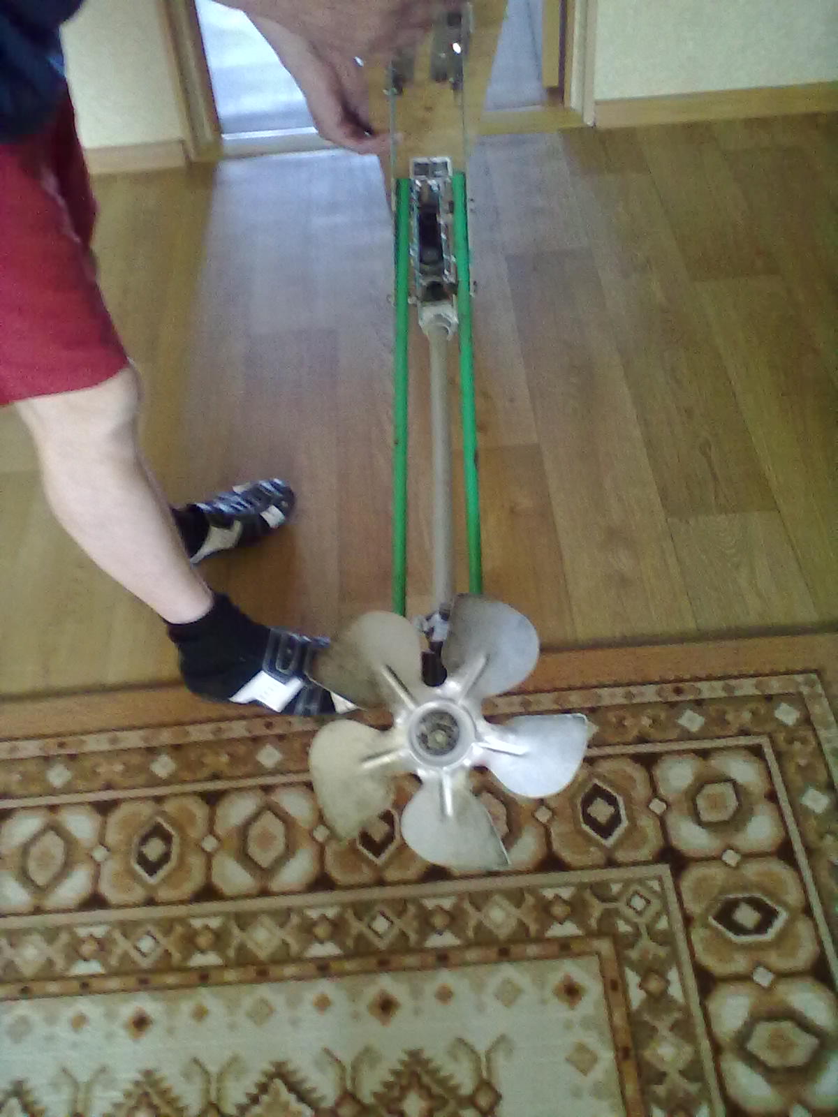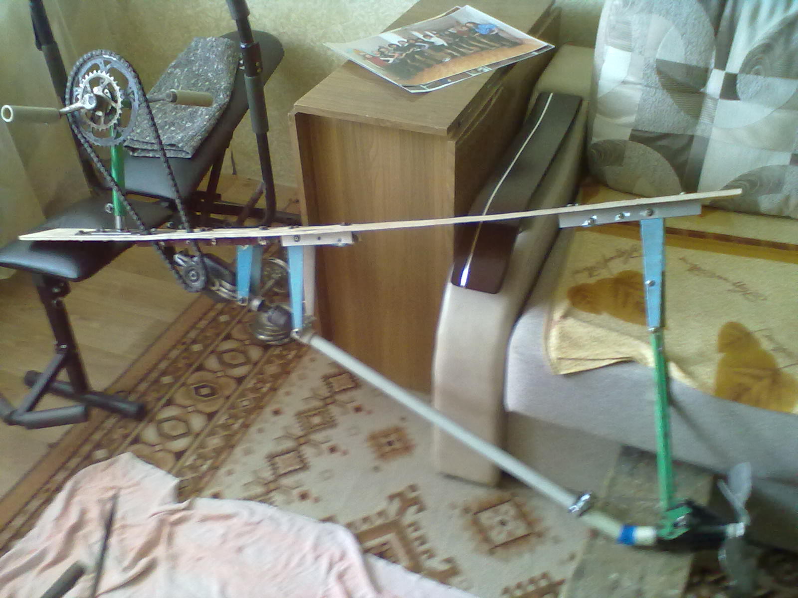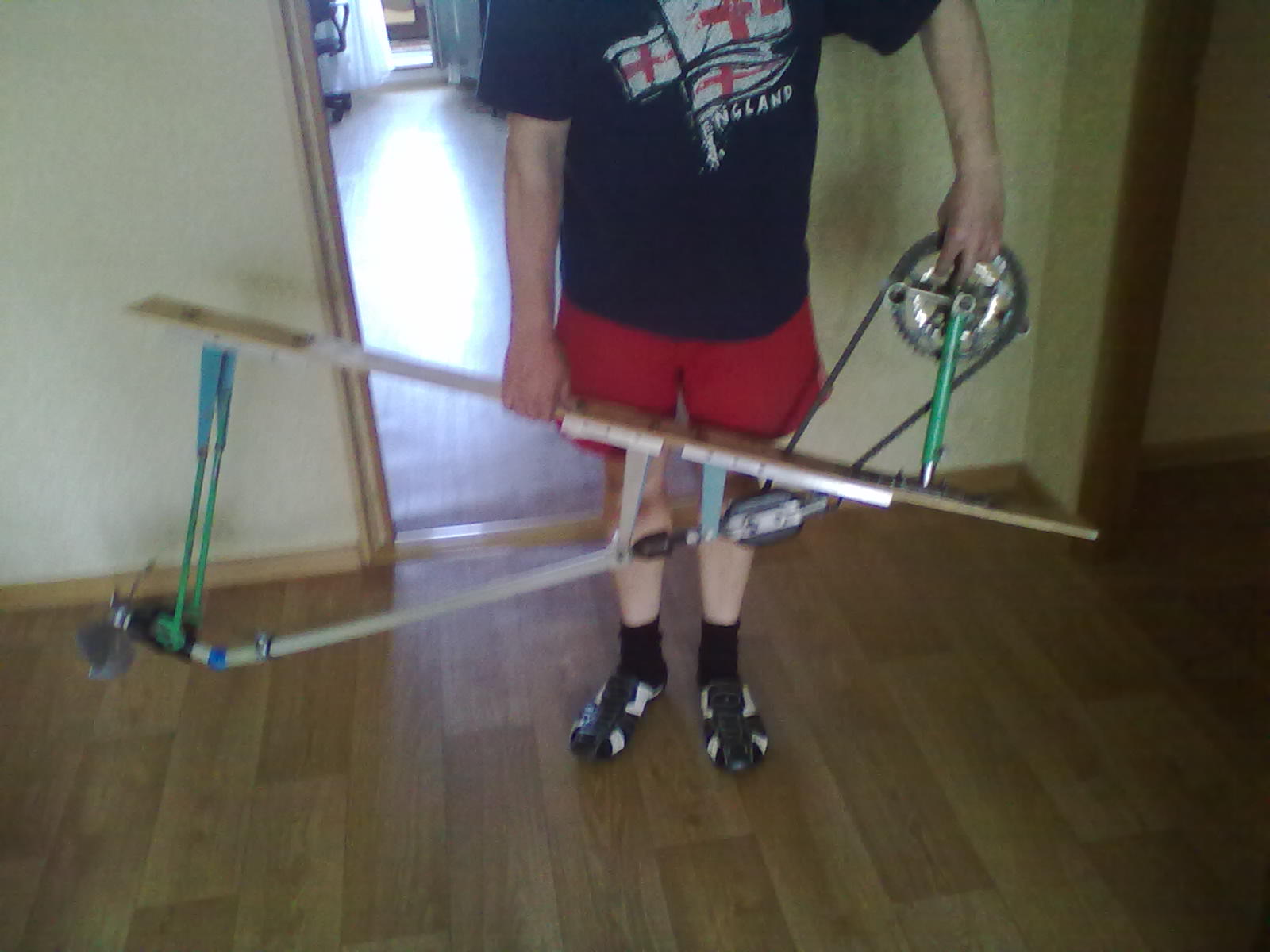 Пядали и для рук и для ног .Там ещё сидуха от офисного стула . Рег...ся от 10 см до пол-метра . Человек длительное время мохет вырабатывать 150 ват не уставая :ne_vi_del: Обороты прибл. 600 на винте :du_ma_et: .. Опять же сколько сала умять . Да ,винтами играться придётся .