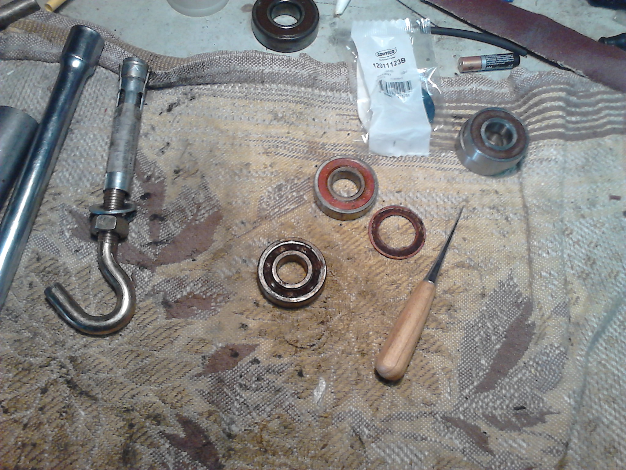 Для демонтажа подшипников применил купленный спецом под это дело, подходящий по диаметру анкерный болт. Оказалось довольно удобно, разжимаешь во внутренней обойме подшипника и выдергиваешь его нах..й вместе с сальником.