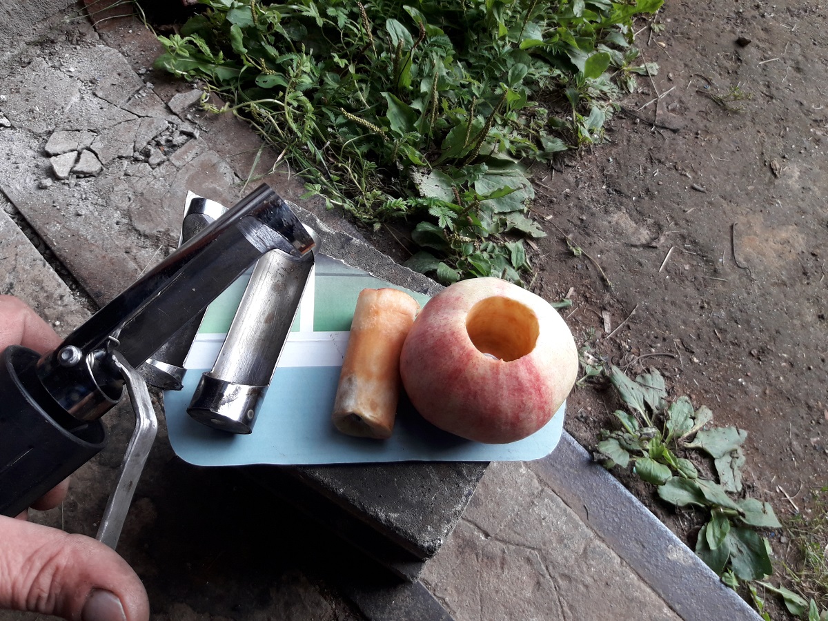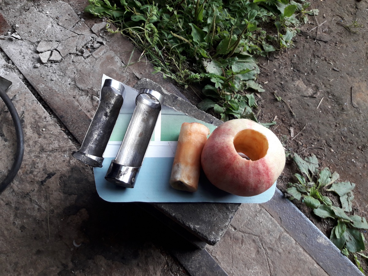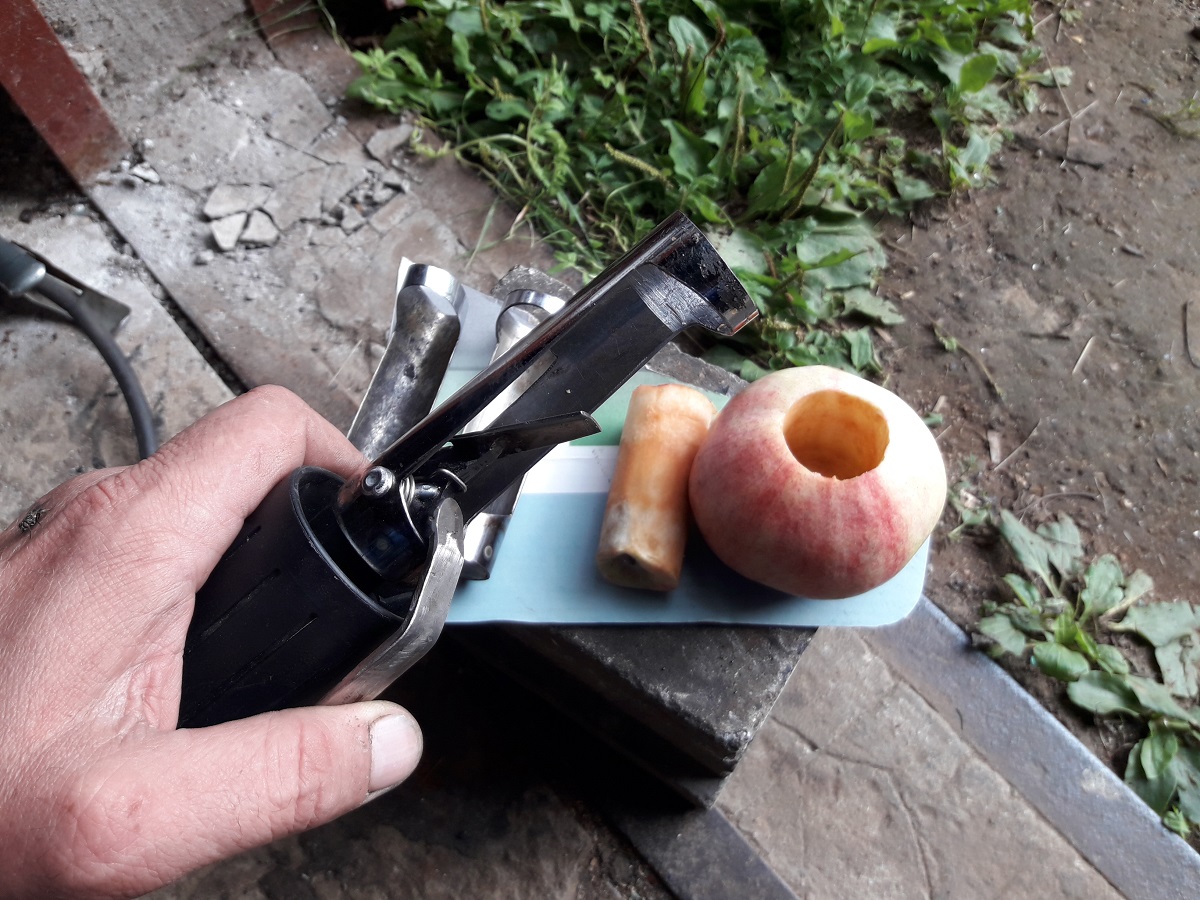 Первыя просечка была из трубки-ручки от пылесоса. Тонкостенная, лезла в яблоки как в масло. Но погнулась быстро.