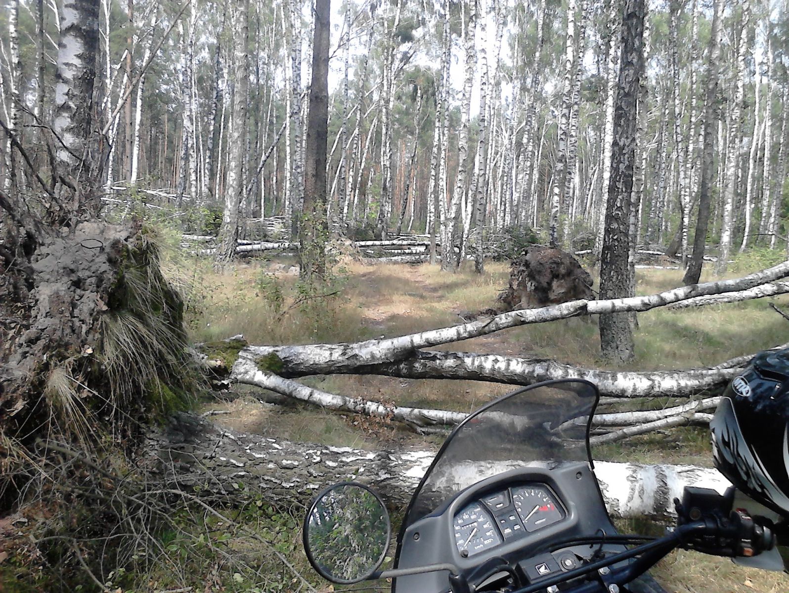 В окрестных лесах после недавних гроз со шквалами опять навалом поваленных деревьев вроде таких как на фото .