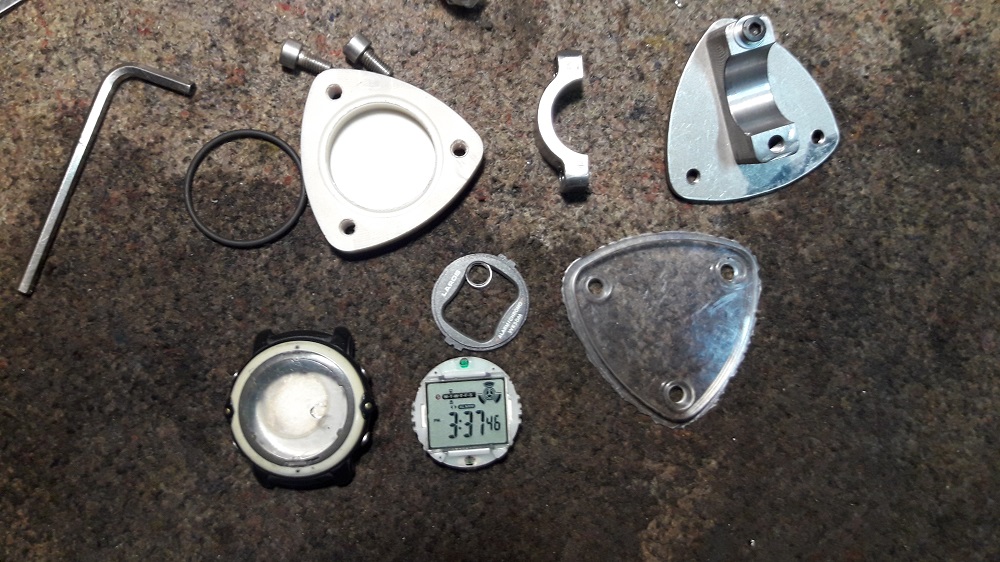 Корпус изготовлен как стакан, вокруг которого установлено резиновое кольцо-уплотнение зажимаемое оргстеклом 6мм.. Заглушку на дисплей, скрывающую корпус самих часов вырезал из пленки от убитой матрицы монитора ноутбука. Что то подкрасил, что то подварил, полирнул болты.