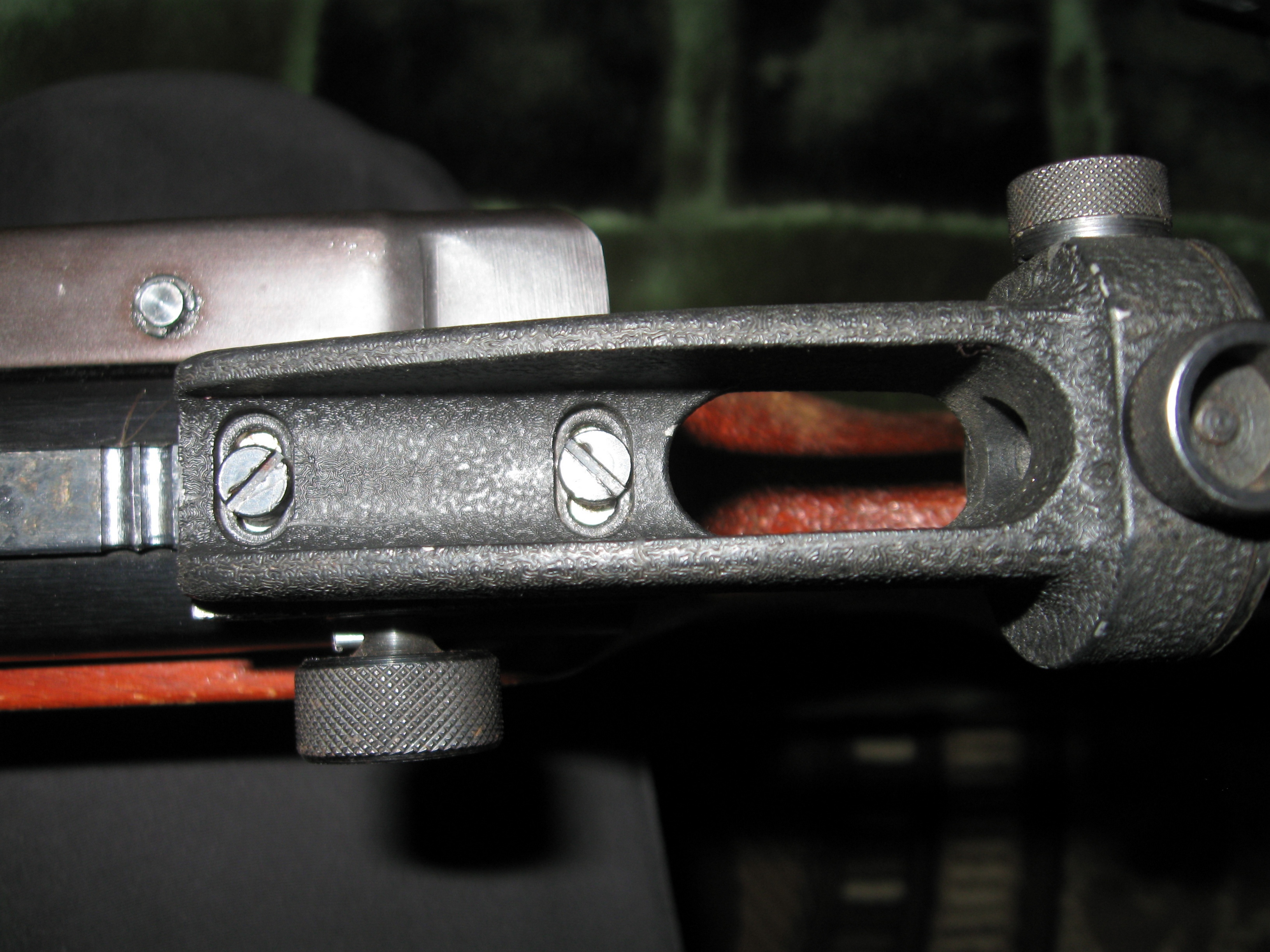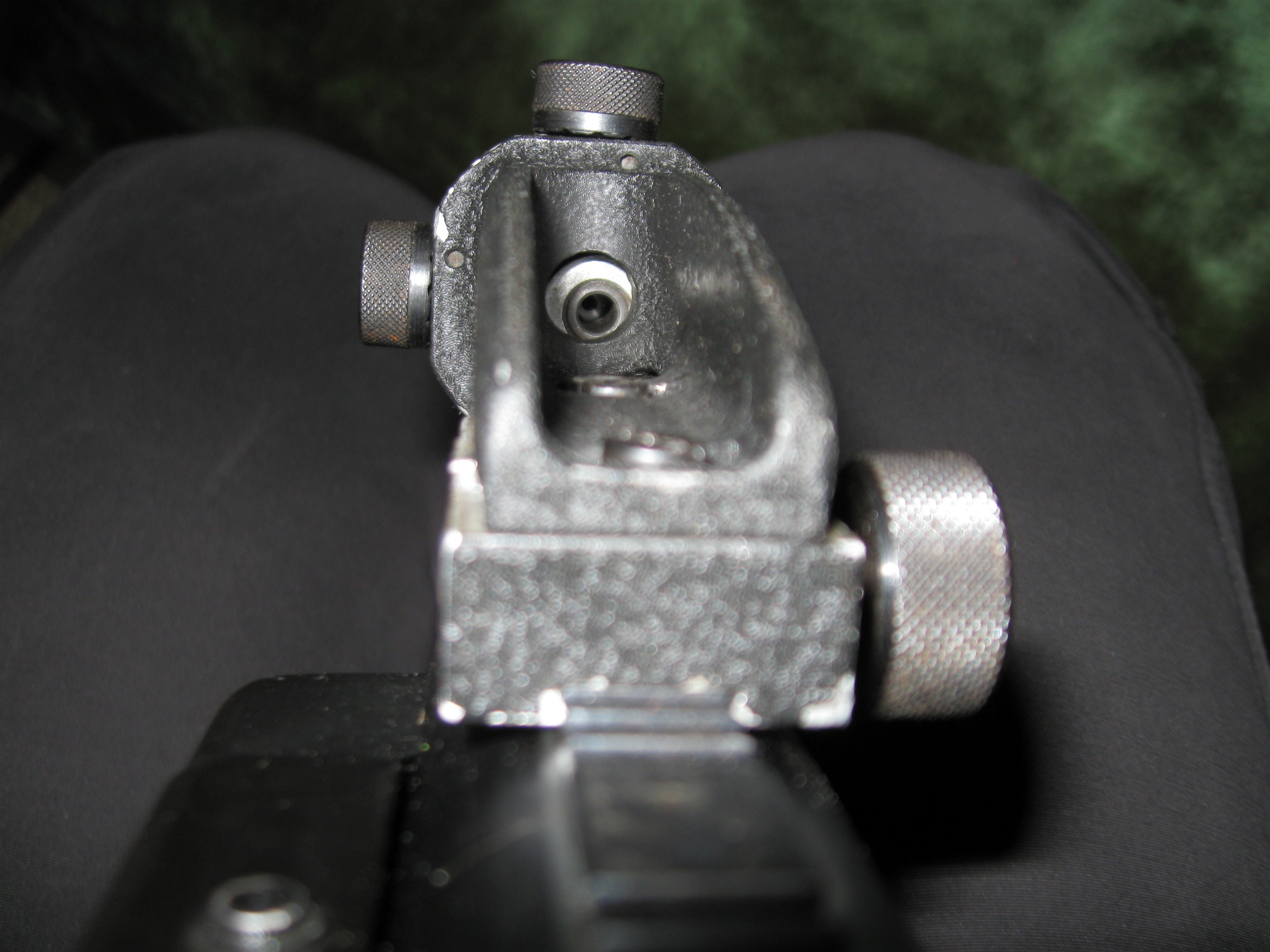 и судя по первому фото диоптра он у вас первым болтом дожат до упора, то бишь жопа поднята относительно второго болта. второй зажмите а первый ослабьте, или может пробовали уже?