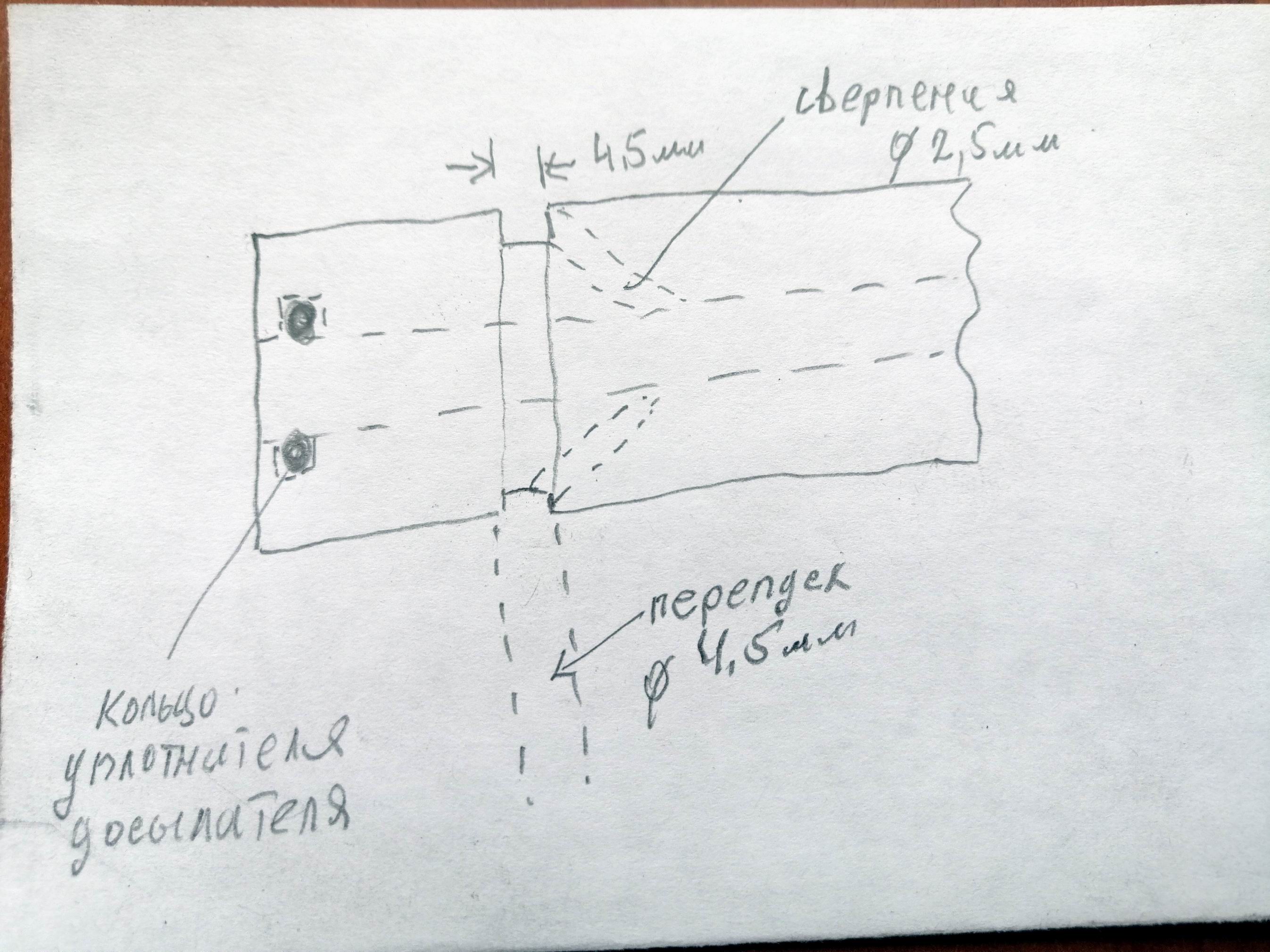 Купил хронограф. измерил скорость. Пулями 0.57гр скорость 157-160 . Вроде норм. но всегда хочется большего. Мне кажется скорость душит диаметр перепуска. его жалкие 3.5 мм. Хочу спросить совета по поводу такой идеи. Сам перепуск в коробке рассверлить до 4.5 мм. А по стволу нарезать наружную канавку и просверлить три-четыре отверстия диаметром 2.5мм. но под наклоном.чтоб потоки газа не сталкивались. а как бы сходились в один поток и дули под юбку пули. Отзовитесь пожалуйста кто встречался с такой схемой. В интернете полный ноль.