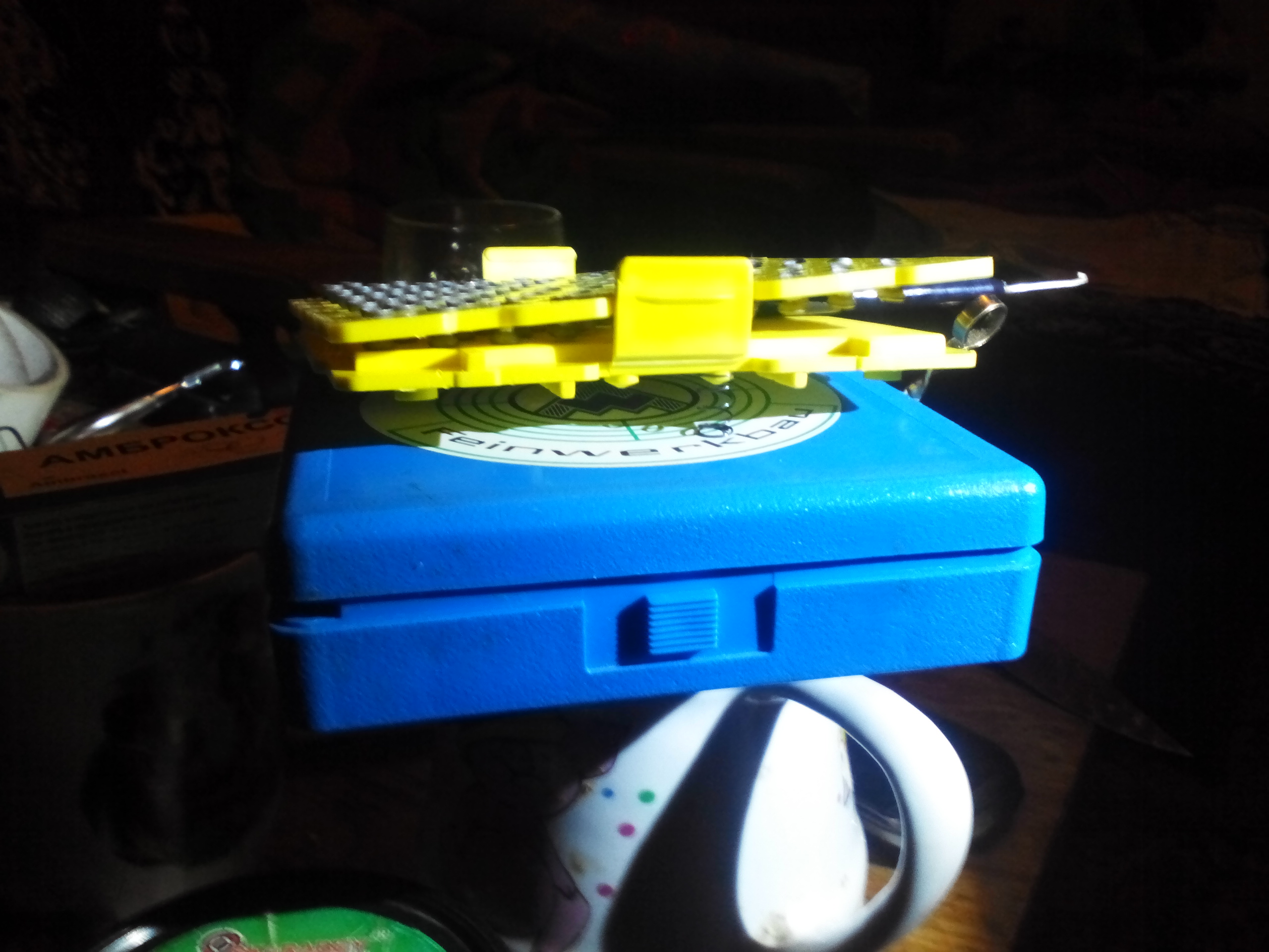 Когда коробка закрывается, упоры опускают нижнюю плоскость, и пульки прячутся, и ещё сверху поролоном прижимаются.