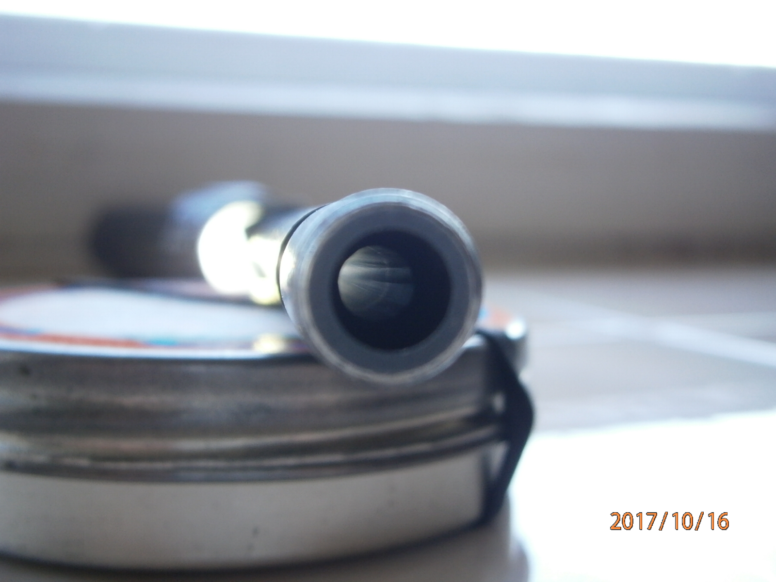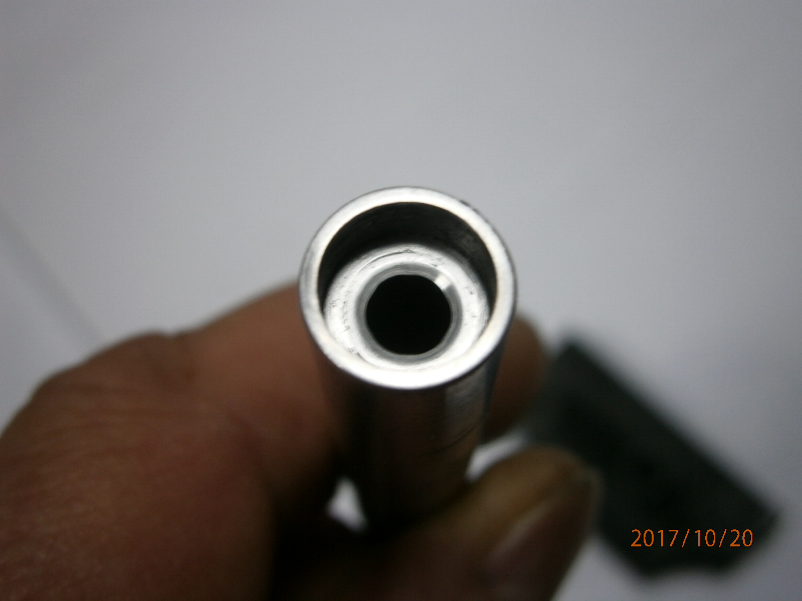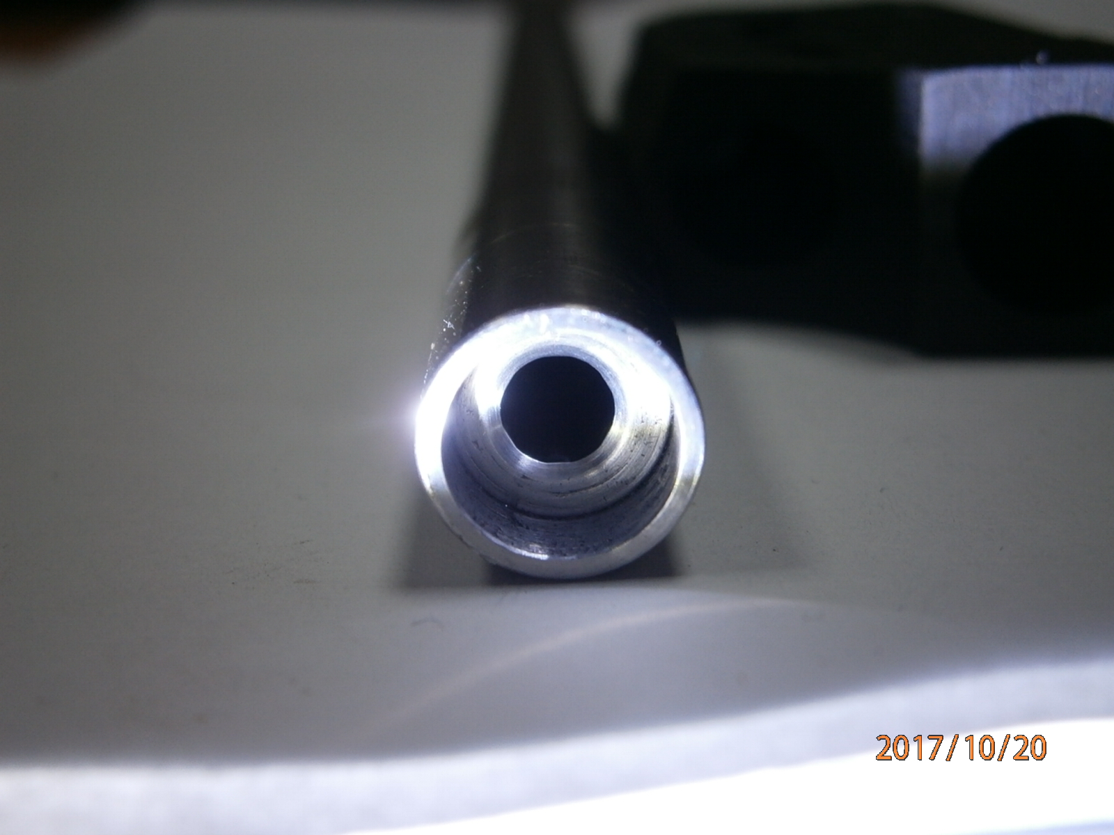 вобщем прикупил МР-53 с пластиковой муфтой. ГП, надульник, съёмный складной приклад -мечта автомана :ya_hoo_oo: . только на 10 метрах куча ниочём :cry_ing: . формат А4 не всегда ловил маслины. перепробовал весь доступный в нашем магазе свинец, но всё безрезультатно. стало ясно, что косяк кроется в стволе после детального осмотра оного. на фото видно светлая полоса псевдочека под проточкой на стволе.