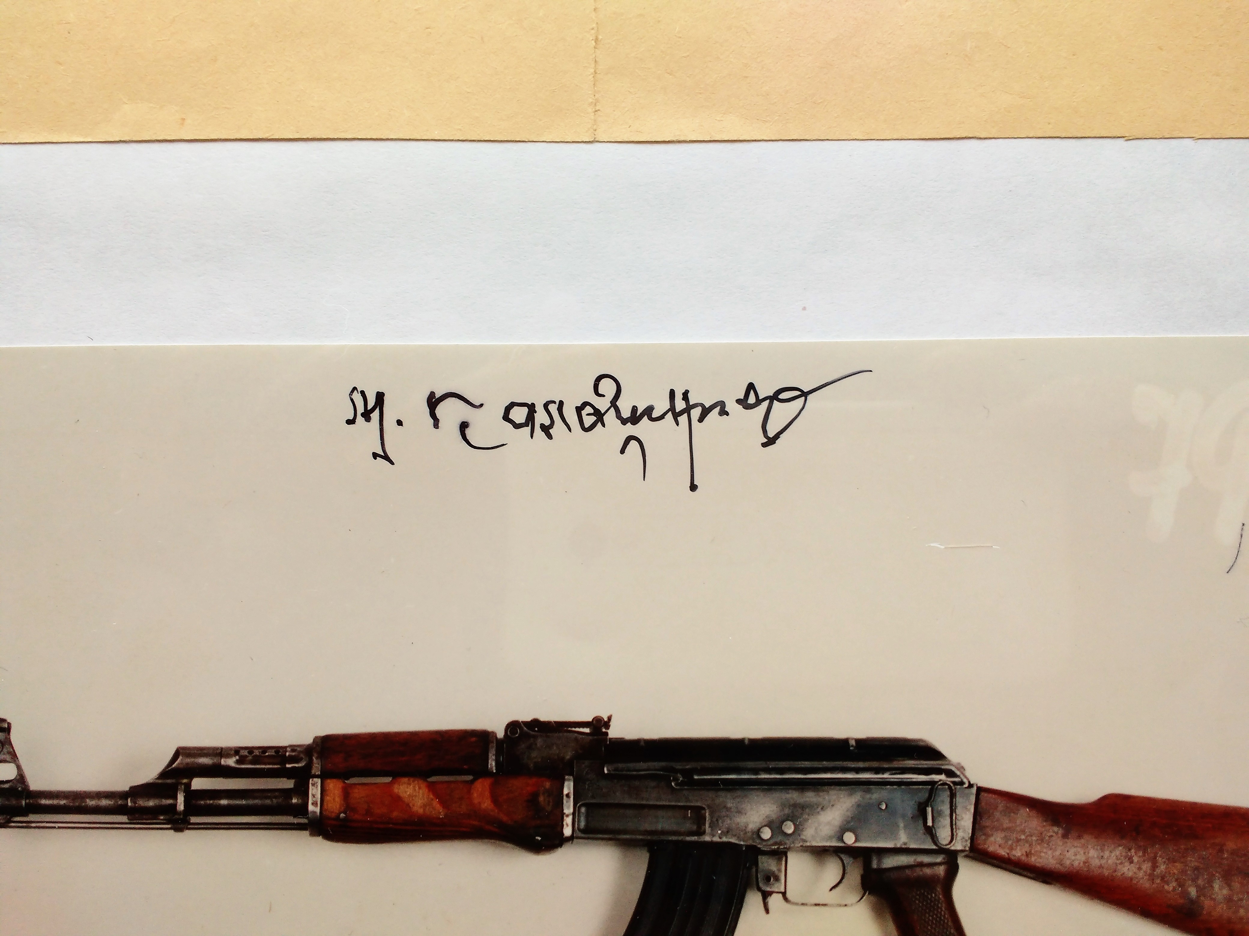 Да простят меня местные жители. Может тут есть любители и коллекционеры ? Предлагаю автограф М.Т Калашникова оставленный им на фото АК-47 первых выпусков (1949-52г) к фото с автографом есть сопроводительное письмо . Это фото было получено в результате переписки с Калашниковым относительно ружья Сайга. Это уже исторический документ. Буду рад общению с который заинтересован в этом. Тел для общения +375333526939 Владимир