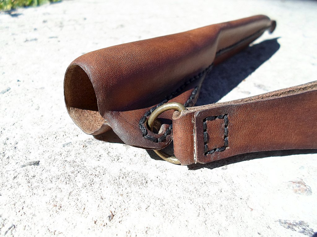 Рукоять: латунь, кожа, тонированная сувель берёзы. Пропитка нат. олифой. Монтаж всадной.