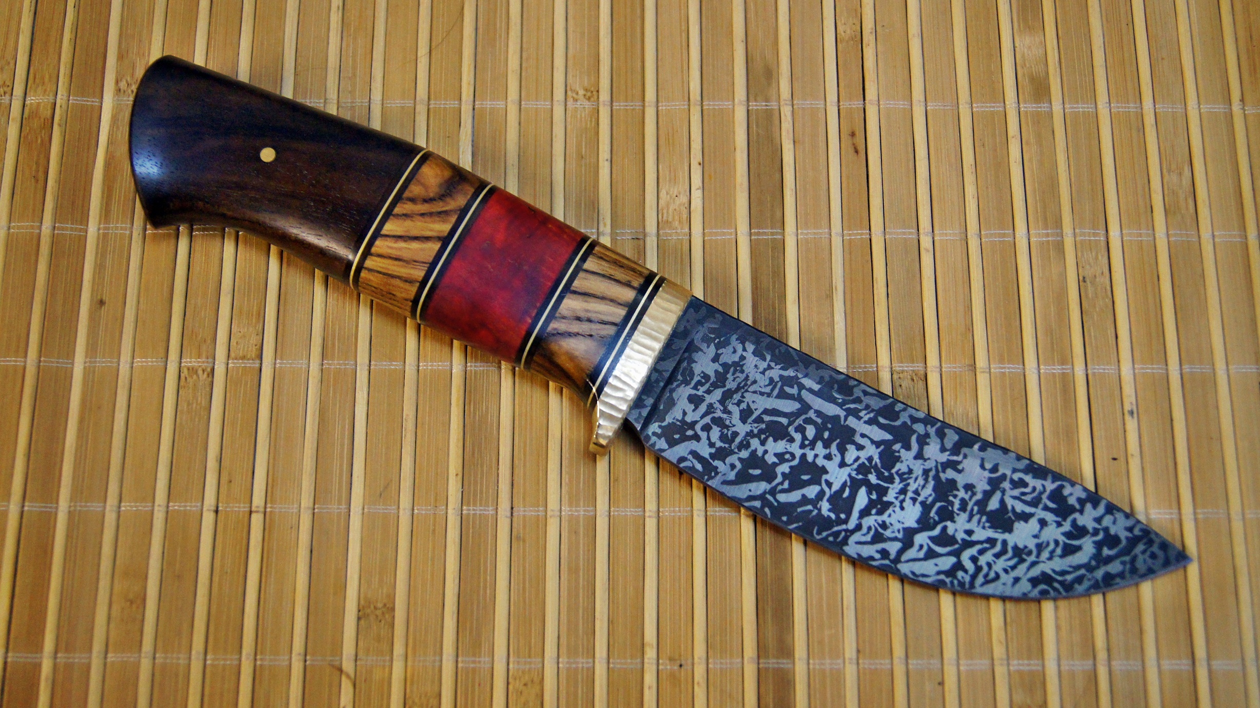 Рукоять латунь,Карельская берёза,орех,пропитка в вакууме.