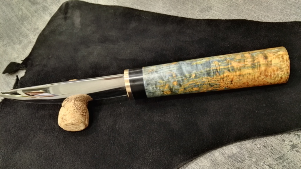 продам красавца якута, немного характеристик: клинок:автор Бондаренко сталь х12мф 135 мм длина, обух толщина 4мм, зонная закалка,твердость по обуху 54-55HRC ед, по РК 59-60HRC,выпуклая линза, полировка в зеркало, сведение 0,1, рукоятка стабилизированная карелка, бронза,эбонит, фибра, ножны дерево, кожа черная растишка от Мони, черный граб,синяя вощеная нить+синий кожаный шнурок, финиш карнаубский воск, длина ножа 270мм, в ножнах-290мм