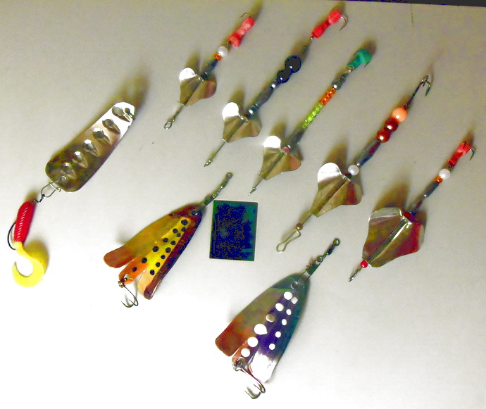На работе в офисе как-то увидел сгоревший чайник из нержавейки вот тут и пришла идея пустить его на лепестки для вертушек.Вырезал лепестки по шаблону у меня их три, отлил в столовой ложке свинцовую биту и штамп готов, заготовку ложем в ложку с верху свинцовую биту и молотком, лепесток готов. Сердечники я давно точу при помощи дрели из пипок от старых автомобильных или тракторных камер, в любом авто гараже их хватает. Проволоку для основы вертушки использую от сварочного полуавтомата диаметром 0,6 мм из нержавеющей стали, покупаю в катушке с намоткой в 1кг. Вот с дужками была проблема как их сделать в домашних условиях на коленке , оказалась всё очень проста пробил гаечным ключом на наковальне и все как две капли, не отличишь. Проволока для дужек используется нихром 1,2мм, можно медную, от трансформатора. Шарики под сердечник хотел взять от бус, но увидел у сына пульки пластмассовые от игрушечного пистолета диаметром 6 мм, просверлил отверстия померил как тут были, пульки продаются в любом игрушечном магазине за копейки. Опушки на крючки давно вяжу из старых бантов. Ну вот вроде и всё.