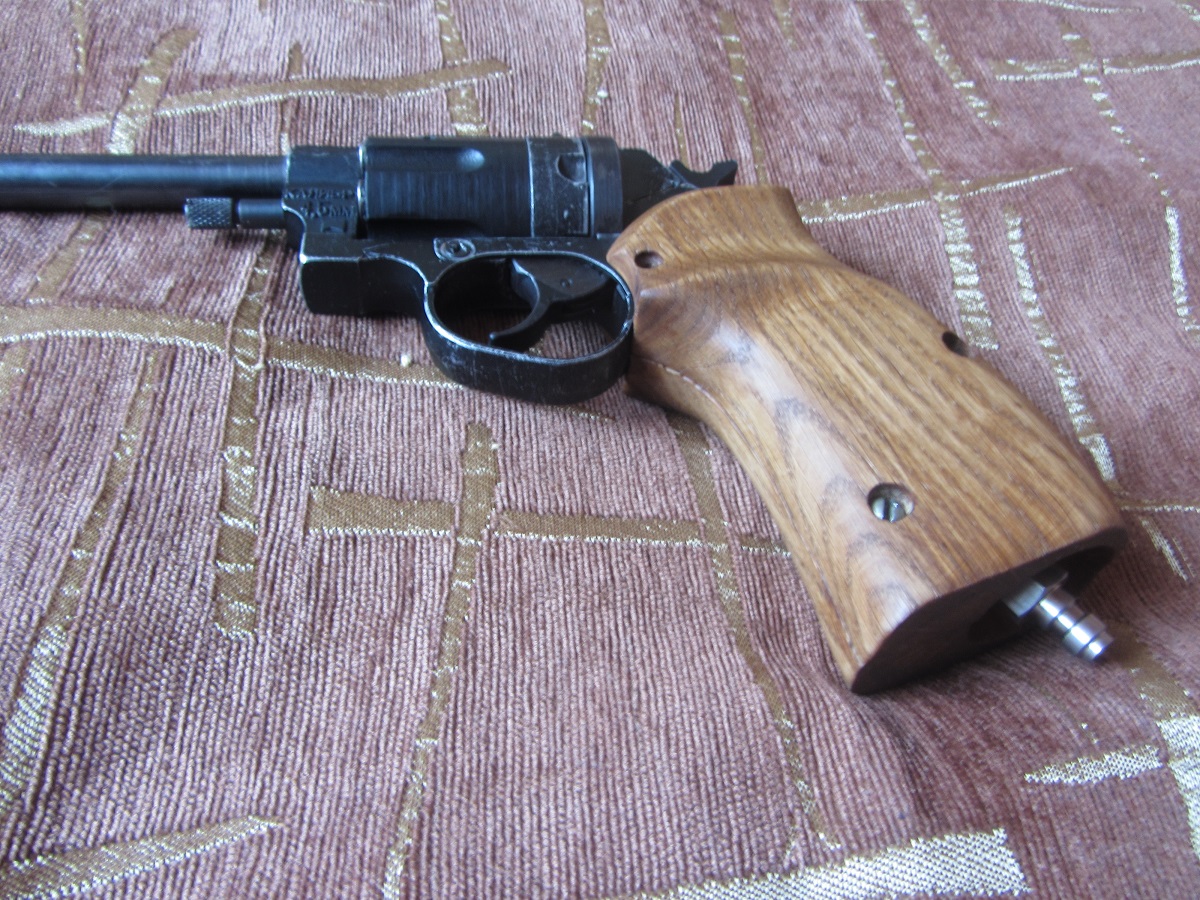 Доброго здоровья всем.Достался и мне РПШ прошедший не одни руки.Каждый новый владелец пытался его тюнить и я в том числе.Некоторые моменты тюна весьма интересны,но спорны.Например барабанчик у меня цельный и вращается весь,половинки соединены металлическими трубками,можно заряжать пули любой длинны и смотрится прикольно,но при этом пуля разогнавшись в барабане,бьется о нарезы в стволе.Второй интересный момент пробка с квиком от Володи,можно залить кислоты с тушилки,или качнуть воздухом.Родная рукоятка - это ужас.Рука у меня не большая,но ручка даже для меня детская и пальцы зажимает спусковой скобой.Решил сделать новую из двух половинок дубовых досочек