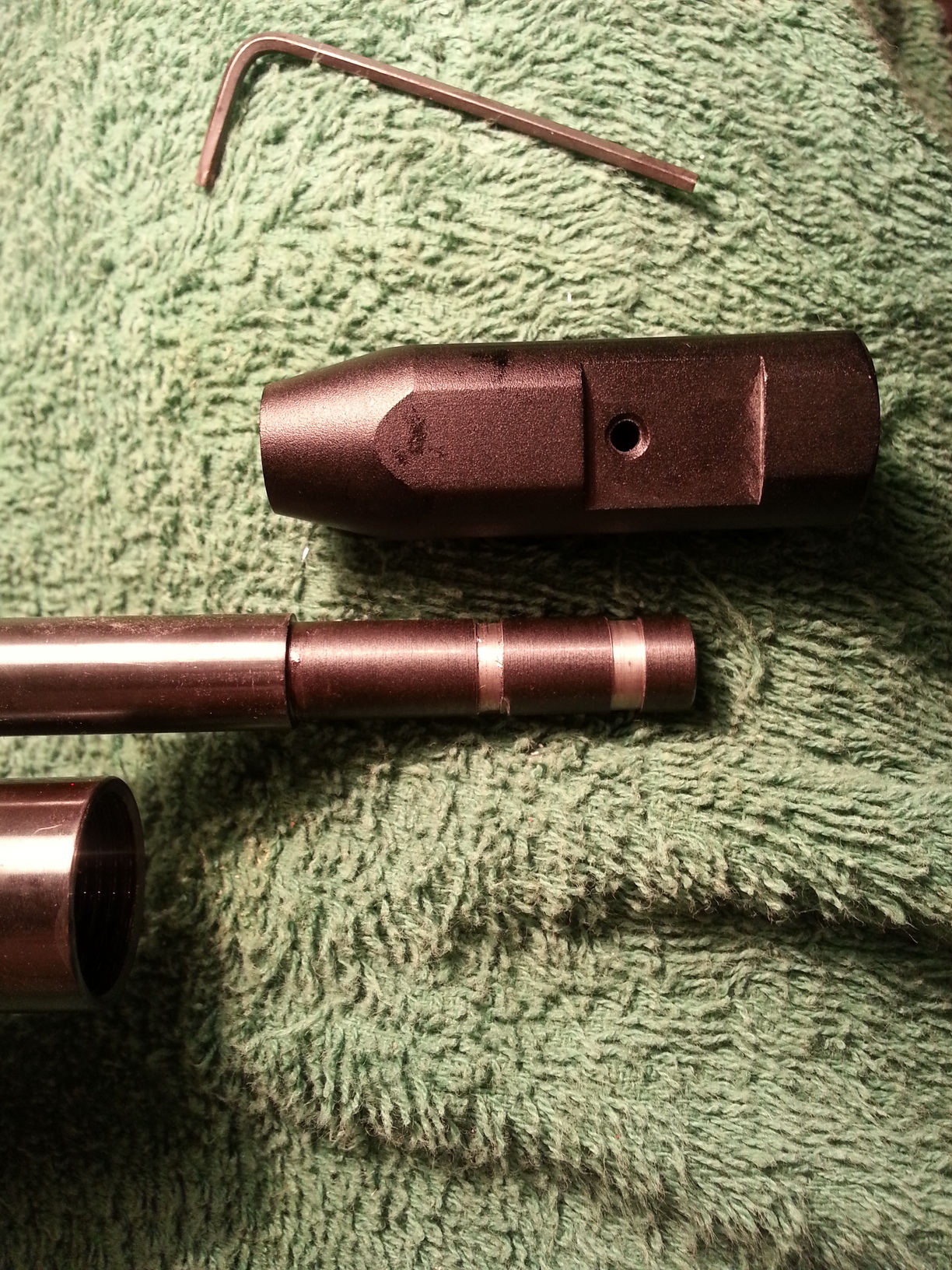 Ладно, АП будет позже, пока продолжаем разбирать. Снимаем надульник. Мушку при этом снимать не обязательно. Винт, который держит надульник, сидит на фиксаторе, поэтому снять его не так просто - шестигранники слизываются, поэтому я вдолбил звездочку и выкрутил трещеткой. Естественно винт при этом придется под замену.