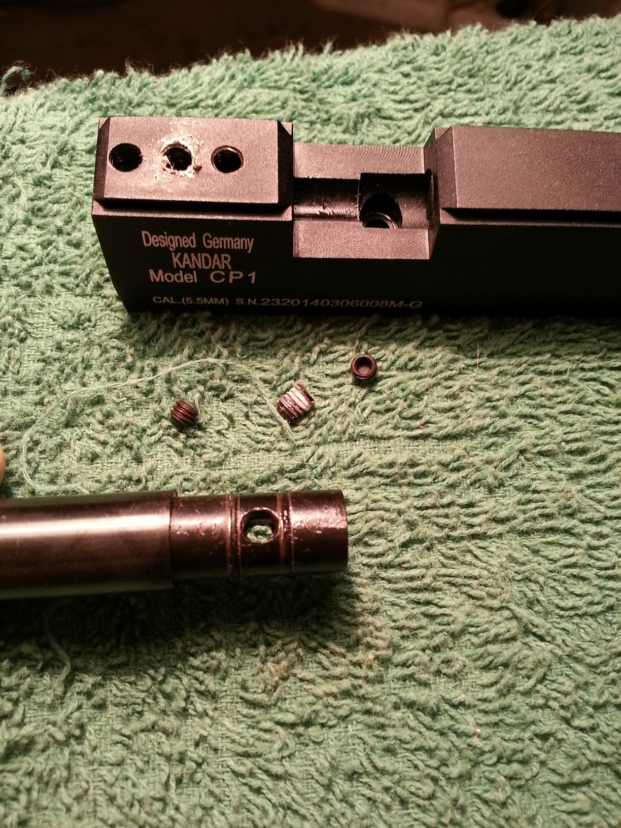 Ствол в коробке держат аж три винта. НО выполняют они разную роль. Два крайних винта выполняют фиксирующую функцию, и открутились от руки. А средний винт оказывается выполняет гермитизирующую функцию, сидя на фиксаторе, и откручивается он тяжело. Потом его закручивать нужно опять же на герметик или фиксатор, ибо отверстие перепуска в стволе, сквозное...