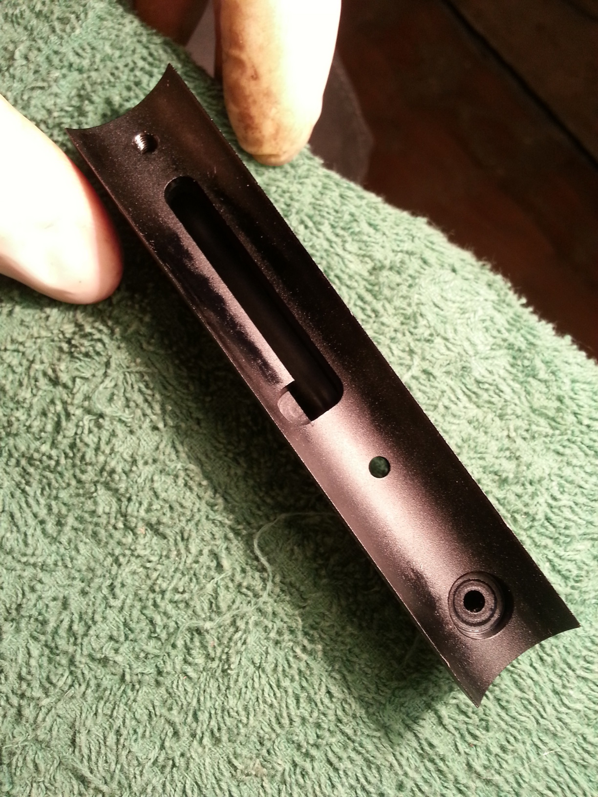 Далее, чтоб снять коробку, выкручиваем сперва болт сзади, он вкручивается в коробку, проходя заднюю пробку насквозь. Достаем пробку, пружину с направляющей. Отводим досылатель и выкручиваем болтик вверху, под казенником. Коробка снята. Пробка и направляющая тоже из алюминия, покрыты анодом. Никакого пластика.