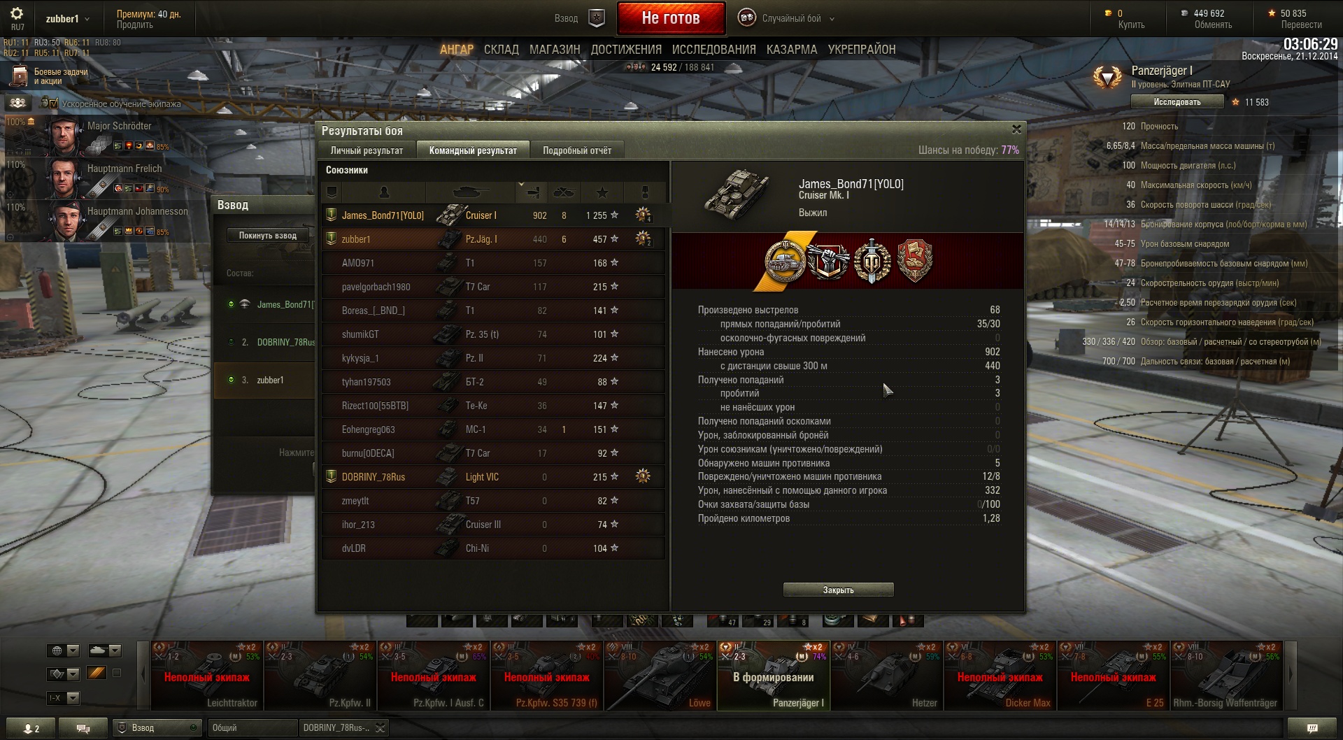 Как "статисты" развальцовывали "нубку".... Выпил я знацца в субботу водовки... да засел в танки. Играли с моим верным совзводником "джеймсомБондом" (кто не в курсе он на предыдущих страницах на скринах во многих боях со мной тащит). Хрен знает как он меня бухого раз за разом "терпит", но многие наши "выдающиеся" бои как раз и случались когда Зуббер в "стельку". Так случилось и на этот раз. Решили под конец "отдохнуть" и "подрихтовать" винрейт за сессию в "песке". Мне удалось "подстрелить" шестерых после чего потянуло "на подвиги", "зарашил" на картоне и слился... Однако у нас часто так бывает, что если слился один "затащит" другой. Но в этом бою камрад "затащил" реально. Пускай и против "нубов", но их было шестеро а он один. "Колобанов" прилогается, как и "решающий вклад". Вообщем вдвоем убили почти всю их команду, 14 танков. Был правда еще третий во взводе... 49 процентное "днище" с моей "питерской" работы... Как оказалось полностью бесполезное в бою хотя мне казалось когда за 20 000 боев то хоть как то уже надо бы уметь играть.. Но после того как "оно" с нами вечер покаталось.... решили что больше его брать не стоит... "Бонд" так вообще был под конец в бешенстве, когда играя на 8-10 лэвелах его этот "друг" пару раз "подпер", пару раз вовремя не поддержал чтобы добить шотника на кд, пару раз засветившись подкатывался сзади и "его плюха" влетала в наши не бывшие в засвете танки.... Вообщем совзводник в процессе не раз с теплом вспоминал Володю, который хотя и не "статист" но на которого всегда можно положится... :co_ol: