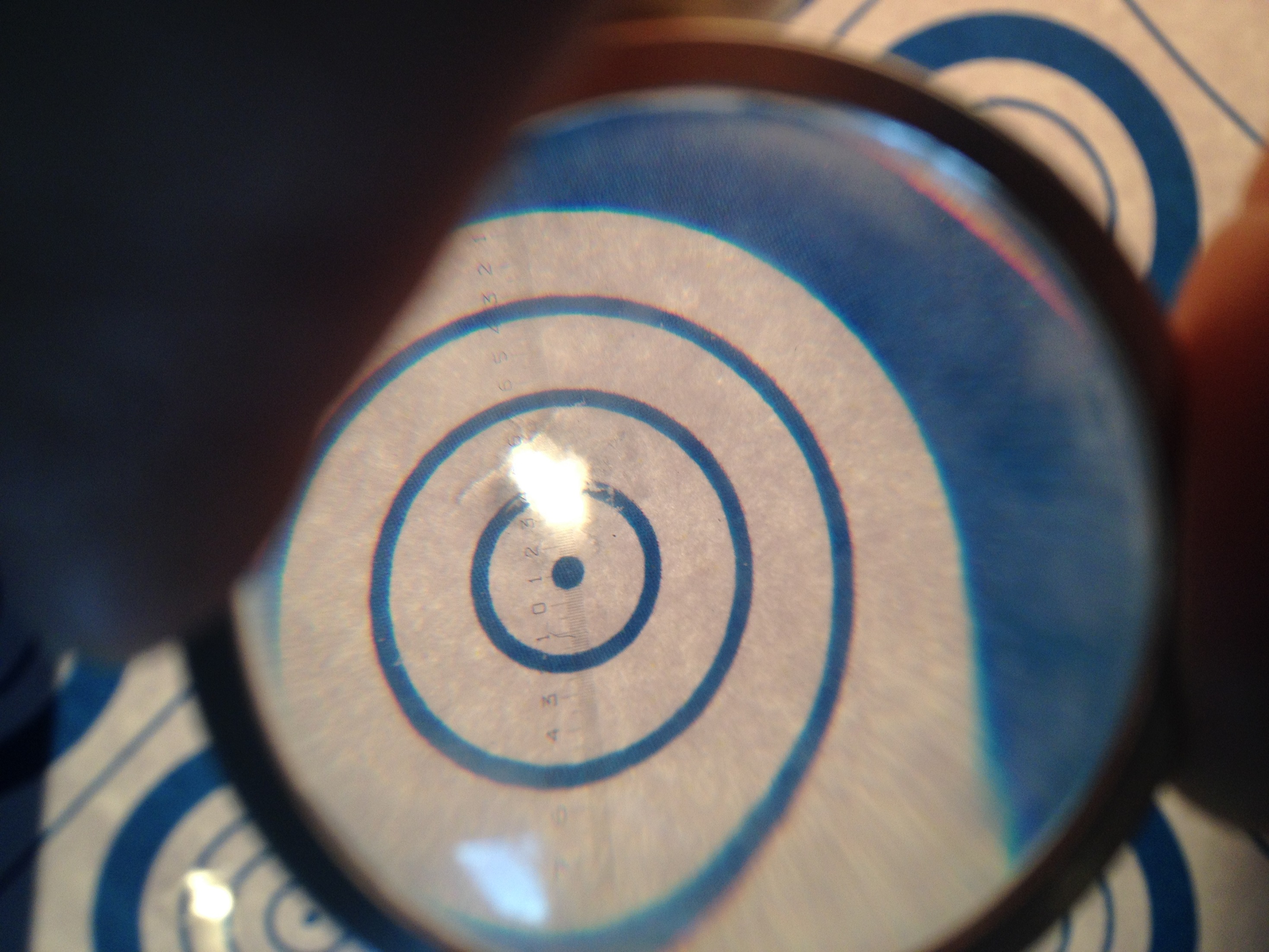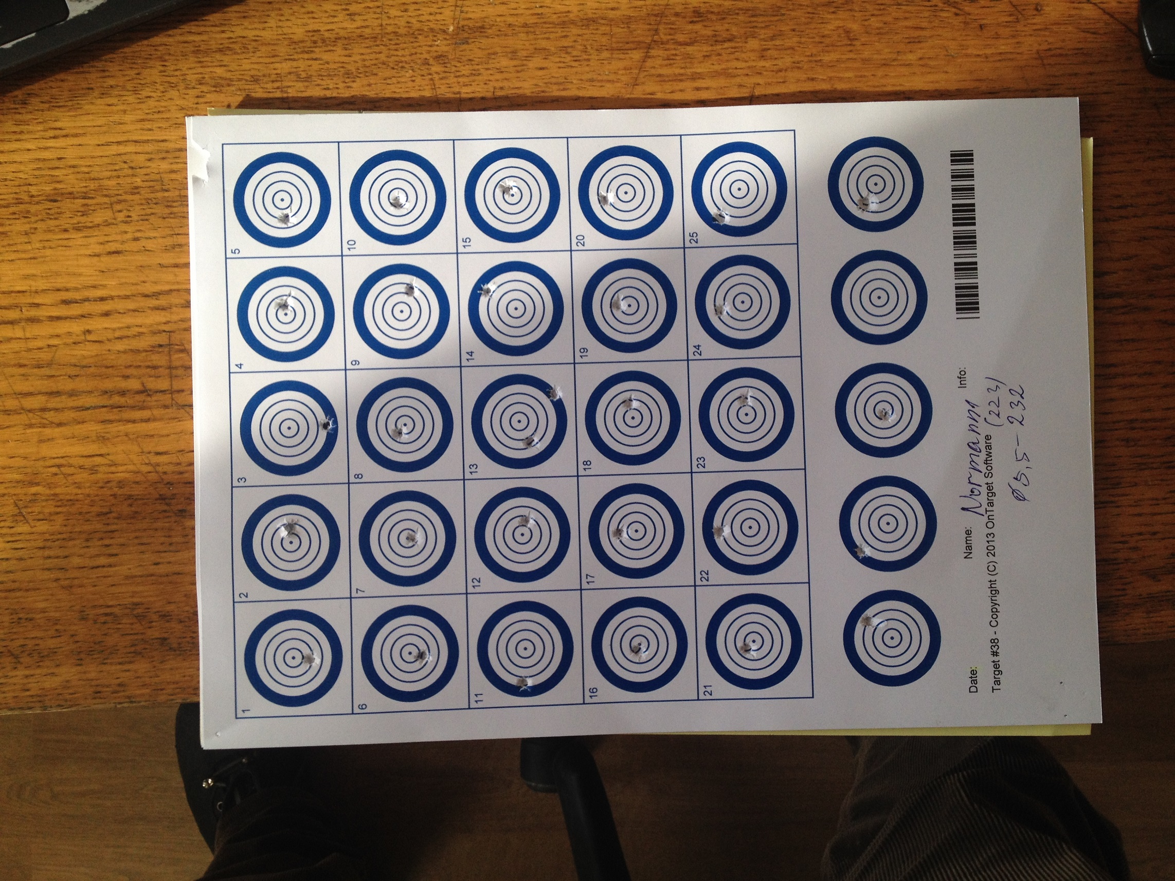 потом взял измерительную лупу и посчитал методом обезьянки диаметром 5,5. То есть ложил линейку лупы по радиусу от отверстия к центру мишени, центр пробоны на 2,75 мм если ноль линейки заходил за середину линии считал в пользу стрелка получилось 232! :sh_ok: