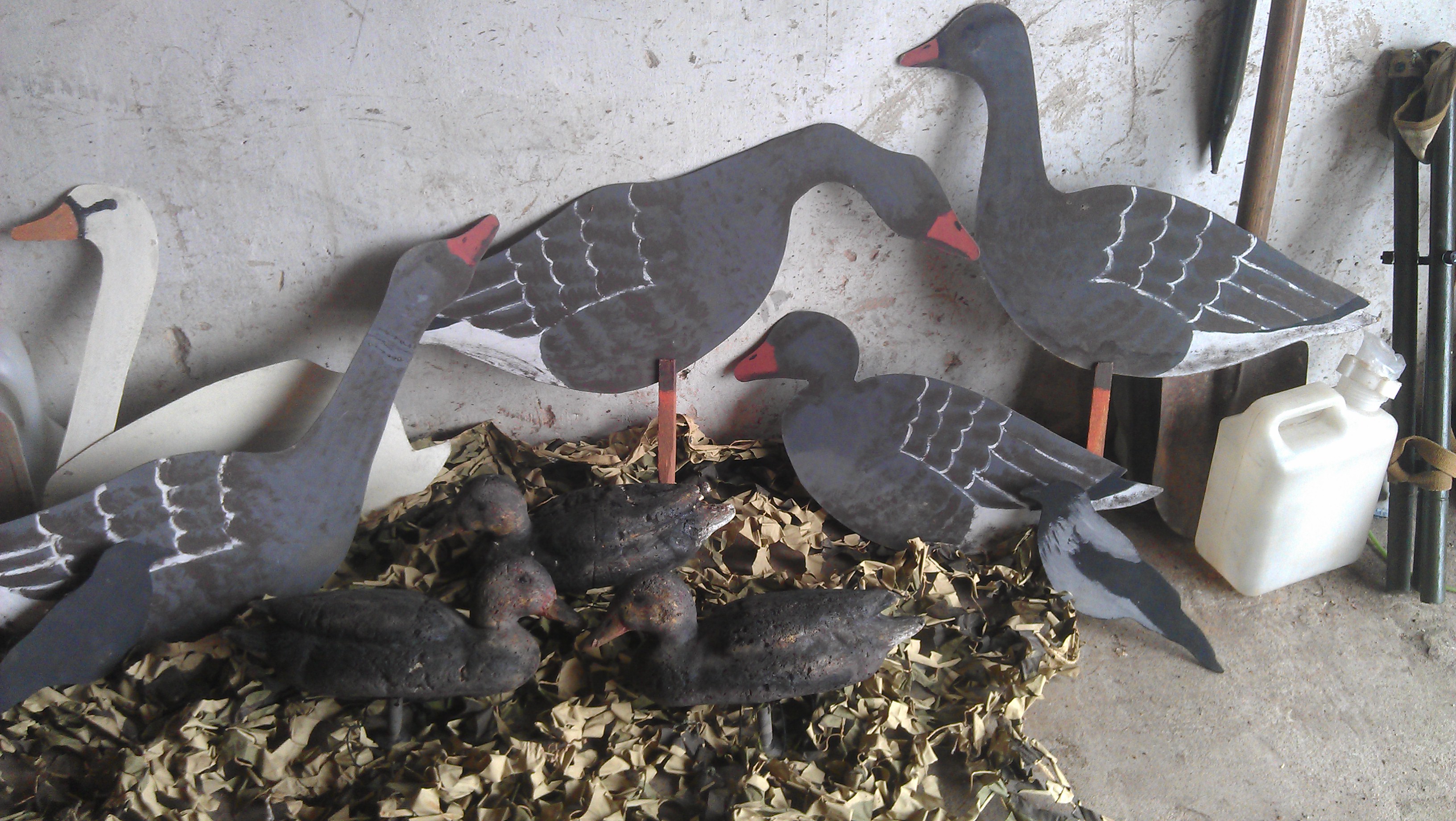 Уважаемые коллеги, разрешите и мне высказать свои соображения в эту тему. Нового я ничего не поведаю, но возможно мои наблюдения смогут быть кому-нибудь полезными. Опыт по гусю я набивал через ноги, как говорят, методом проб и ошибок. В результате кое-какой запас знаний имею. Самое первое, немаловажное-это разведка. Я начинаю прочёску поздней осенью, наношу на карту потенциальные места кормёжки, перепаханную кукурузу, зерновые, стерню. Перед открытием сезона уже при наличии птицы по двое-трое суток по утрам и вечерам ношусь по району в поисках перспективных мест. Убил в хлам подвеску, оторвал бампер, но это того стоит. Вычисляю птицу, веду наблюдение с помощью бинокля зашкерившись, иногда из авто, тщательно записываю в блокнот время прилёта, маршруты, примерное количество. Вижу как они кормятся, выясняют отношения, передвигаются небольшими табунками ровненькими колоннами. Отсюда, кстати, я и стал выставлять профиля почти ровным строем, естественно поворачивая каждый для создания видимости стаи. В течение всего сезона страдаю бессонницей, т.к. этот вид охоты очень обожаю. Постоянно анализирую все свои огрехи, делаю выводы. Использую масксеть 3Х6, лёгкий переносной разборный каркас для скрадка. Время сборки не более 10-ти минут. Профиля, которых у меня (у нас) около 60-тидесяти, манки, причём исключительно сделанные своими руками (около десятка раздарил друзьям), они себя неплохо уже зарекомендовали. Смастерил самодельный леший: отдельно халат (сетчатый овощной мешок, нити из мешковины, льняная верёвка и ещё всякий шмурдяк, независимый головной убор, копыта накрываю мешковиной, обшитой лыком. Фото приведены ниже. Практика показывает, что гузманы идут к профилям, когда они (гузы) ещё не настёганные, причём чем меньше стайка, тем больше шансов. В разгар сезона скрад также провозил в багажнике. Тут самым эффективным оказался леший. Слегка окапываюсь, под задницу лёгкий самодельный трапик, накидываю на него кусок сетки, ну и собственно сам. Под мешковину, которой накрываю ноги вбиваю 4 маленьких колышка, чтобы вопросов по сооружению скрадка не возникало. Лазанием по канавам не занимаюсь из принципа. В таком виде напарник, лежащий в 5-ти метрах уже и сомневается, различает ли он меня. Позиция для стрельбы не самая удобная, но эффект громаден. Тут, главное, найти присадку (профиля могут помешать, но парочку держать при себе необходимо) и маскировка. Все ухищрения пойдут коту под хвост, если разведка срисует стрелка. Малейшее движение, малейший блик и всё, пизнес, если повезёт, то налетит другая стая. Вот они делают первый заход к обосранной ими луже, прямо у нас над головами. Не стрелять шепчу. Напарник аж бзднул от злости, второй круг на присаду, не стрелять, дружище уже чуть не плачет, третий заход, выпускают шасси и чуть ли не на голову начинают садиться. Огонь! 4 особи из сделавших роковую ошибку остались лежать без движения. Вот он кайф! Я их усадил почти к своим ногам. Я готов пожертвовать трофеем, хотя руки очень чешутся, но я вычислил птицу, всё расчитал, перехитрил её. Вот для меня главное. Оружие: 27-й, патроны в стволах разные, контейнер и пыжевой, исключительно самокруты, всё больше склоняюсь к более мелким номерам дроби. К сожалению до сих пор не всегда получается расчитать упреждение, стараюсь стрелять под перо в угон, если повезёт, то на пасадке 
